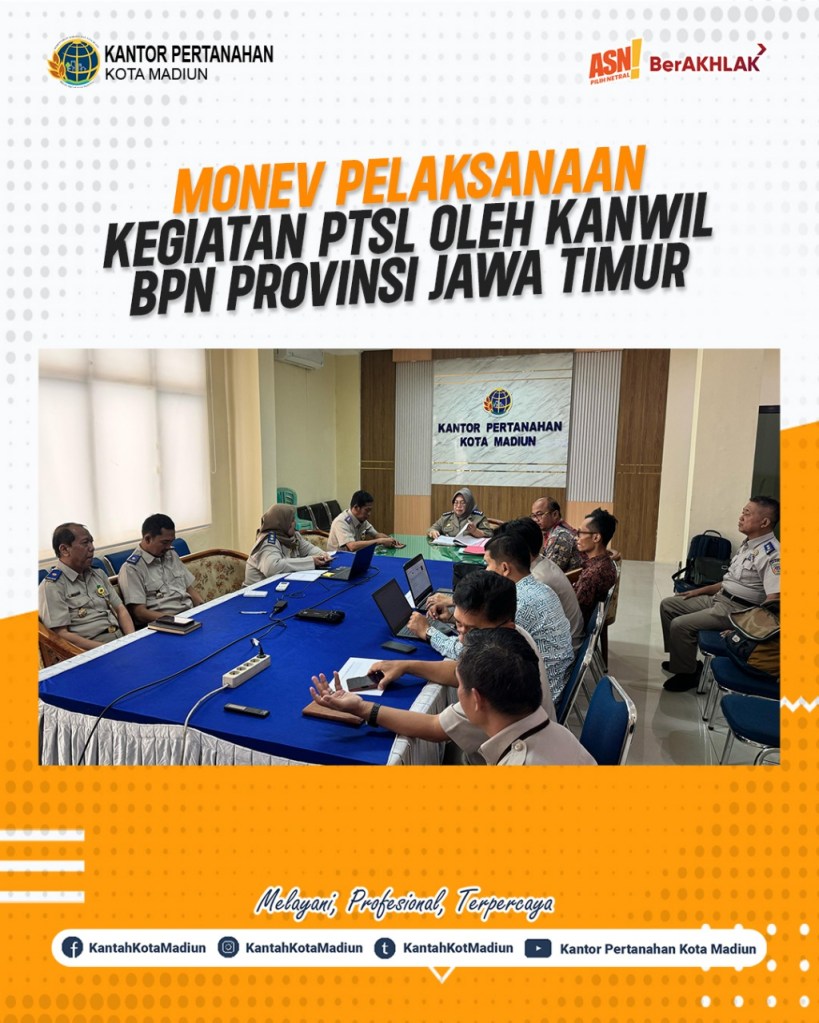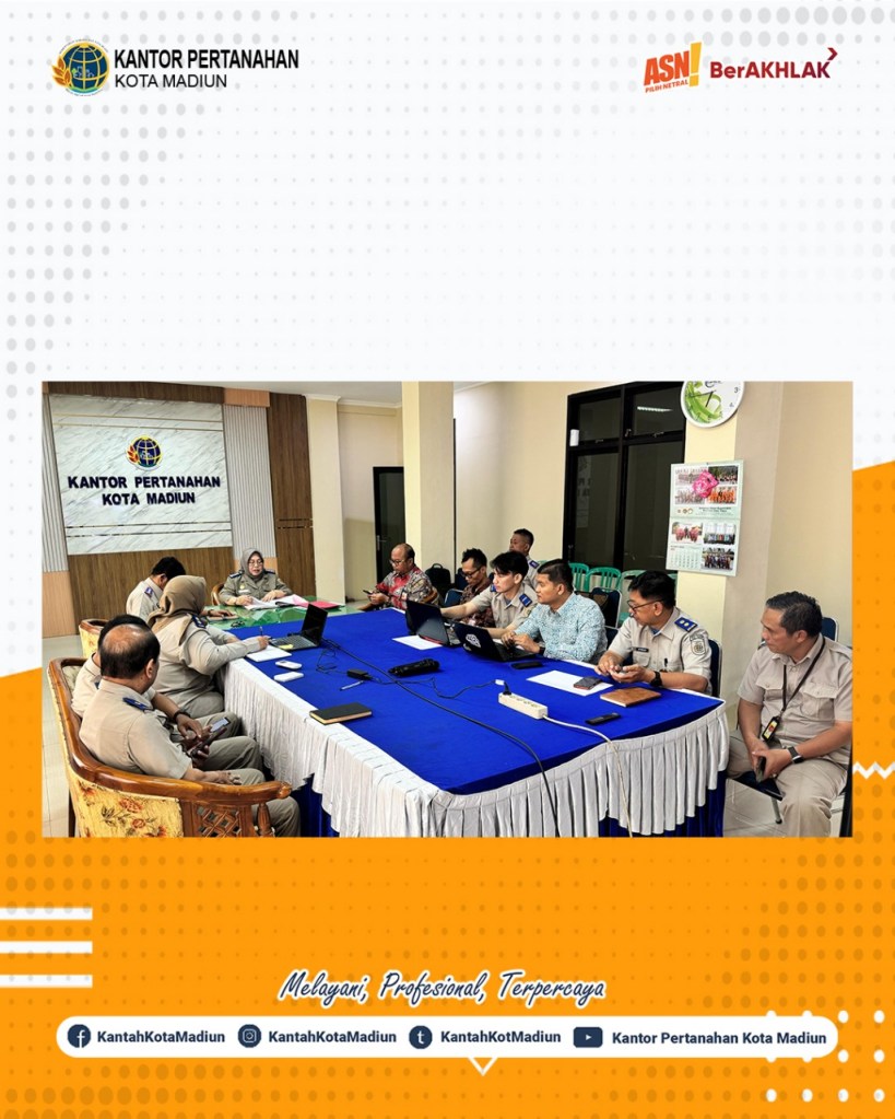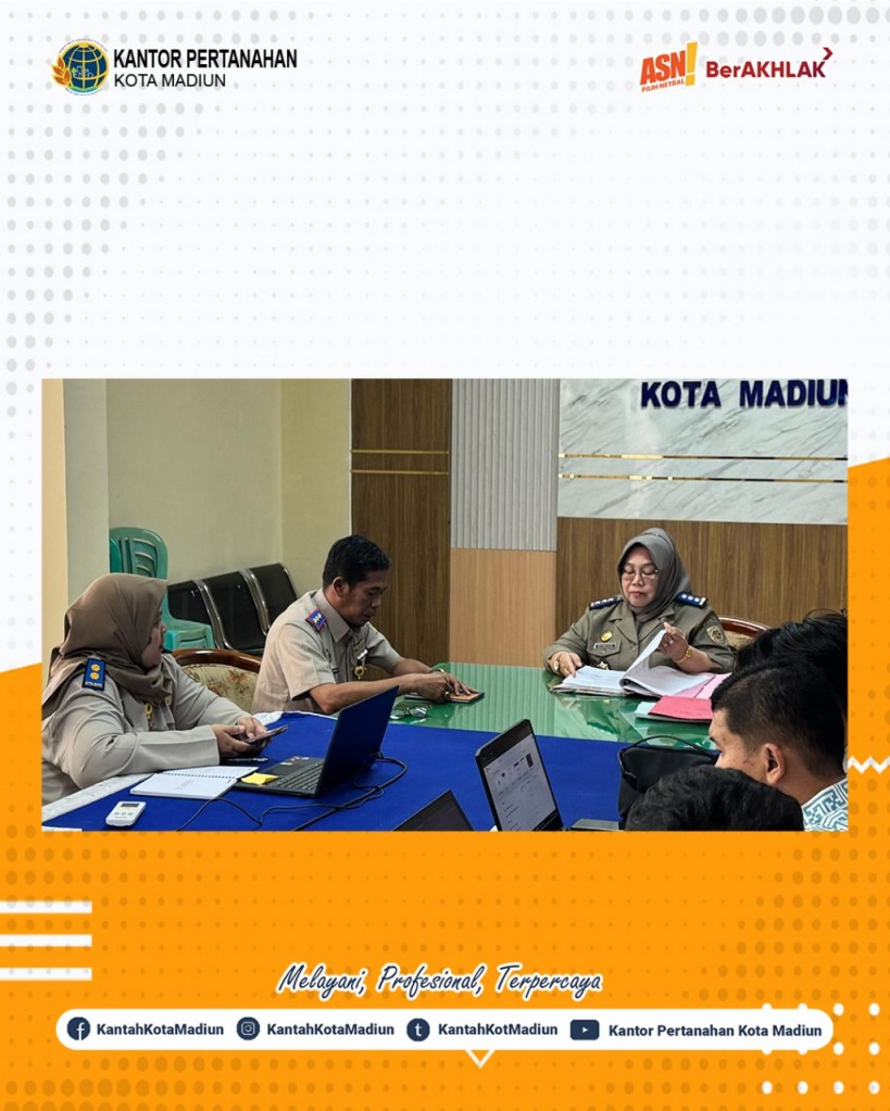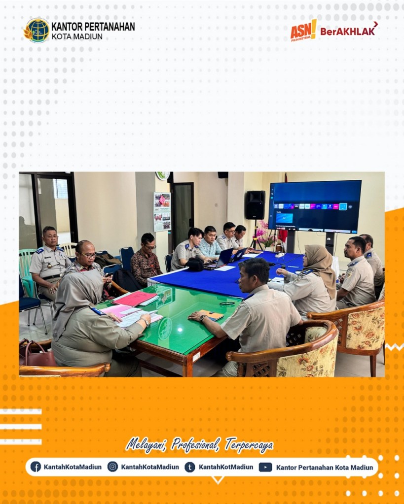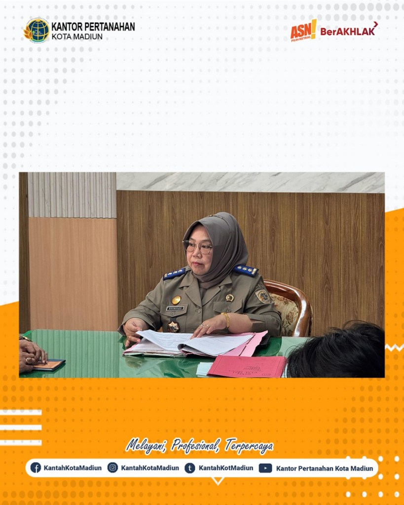 Halo #SobATRBPN, Hari ini Selasa (1/03/2025) Kantor Pertanahan Kota Madiun mendapat kunjungan dari Kepala Bagian Tata Usaha Kanwil BPN Provinsi Jawa Timur, Ibu Kusniyati, S.SiT., M.MPub bersama dengan Bapak Arief Wibowo, S.H., M.E. dan disambut hangat oleh Kepala Kantor Pertanahan Kota Madiun, Bapak Triawan Saleh, S.T., M.Si. bersama dengan Seluruh Pejabat Pengawas Kantor Pertanahan Kota Madiun.