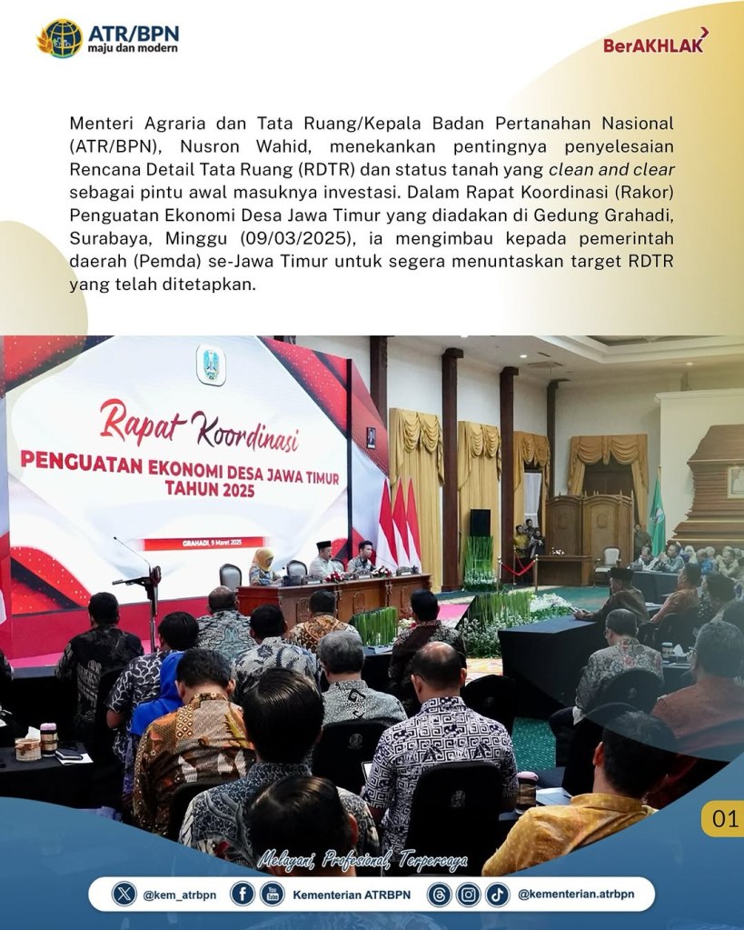 Menteri Agraria dan Tata Ruang/Kepala Badan Pertanahan Nasional (ATR/BPN), Nusron Wahid, menekankan pentingnya penyelesaian Rencana Detail Tata Ruang (RDTR) dan status tanah yang clean and clear sebagai pintu awal masuknya investasi. Dalam Rapat Koordinasi (Rakor) Penguatan Ekonomi Desa Jawa Timur, ia mengimbau kepada pemerintah daerah (Pemda) se-Jawa Timur untuk segera menuntaskan target RDTR yang telah ditetapkan.
