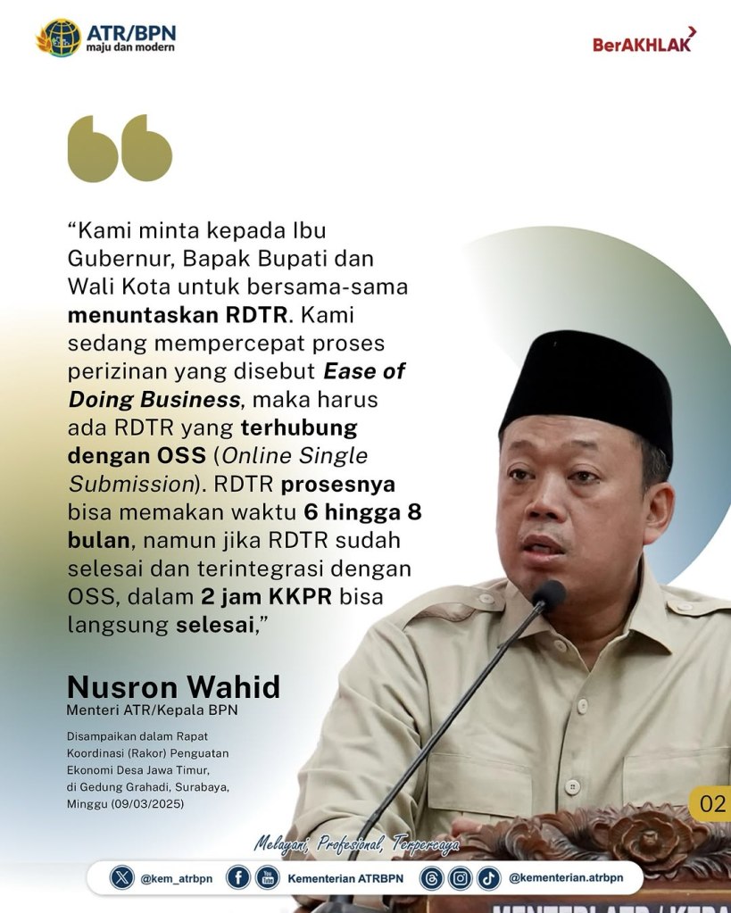 “Kami minta kepada Ibu Gubernur, Bapak Bupati dan Wali Kota untuk bersama-sama menuntaskan RDTR. Kami sedang mempercepat proses perizinan yang disebut Ease of Doing Business, maka harus ada RDTR yang terhubung dengan OSS (Online Single Submission),” ujar Menteri Nusron dalam pertemuan yang diadakan di Gedung Grahadi, Surabaya, Minggu (09/03/2025).
