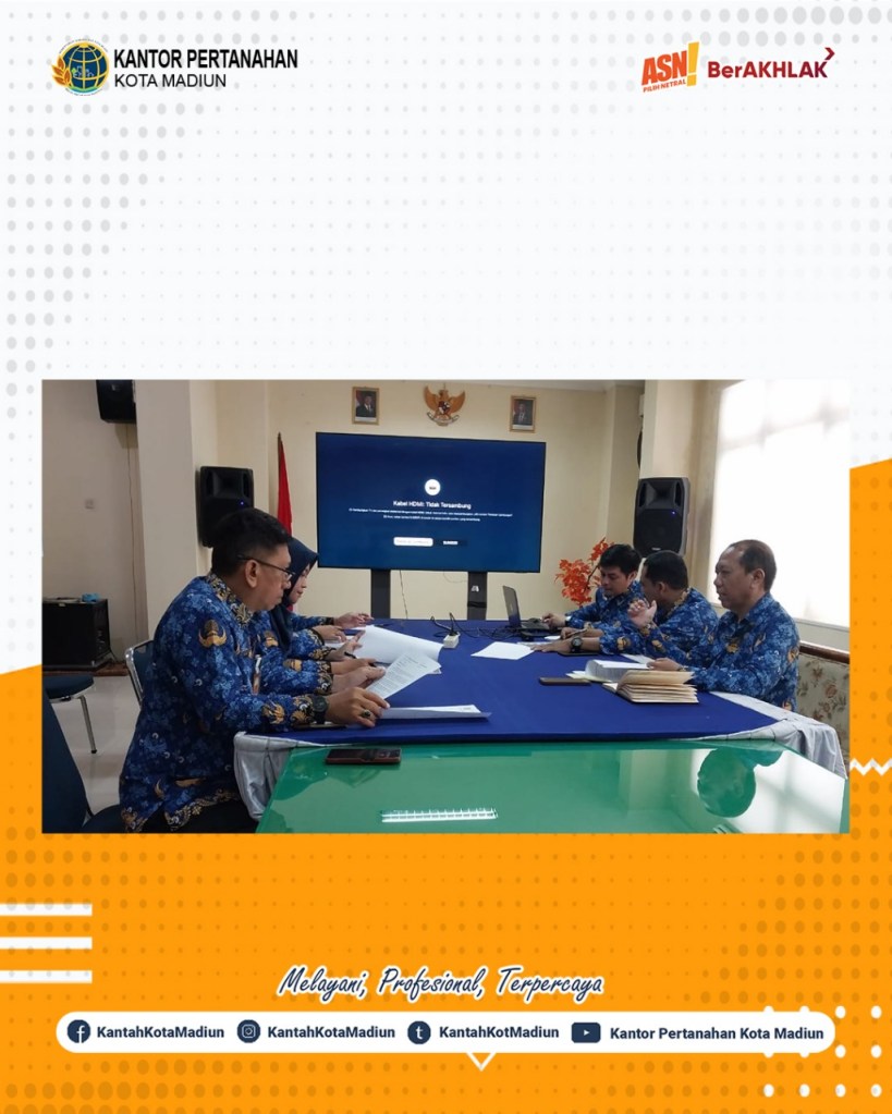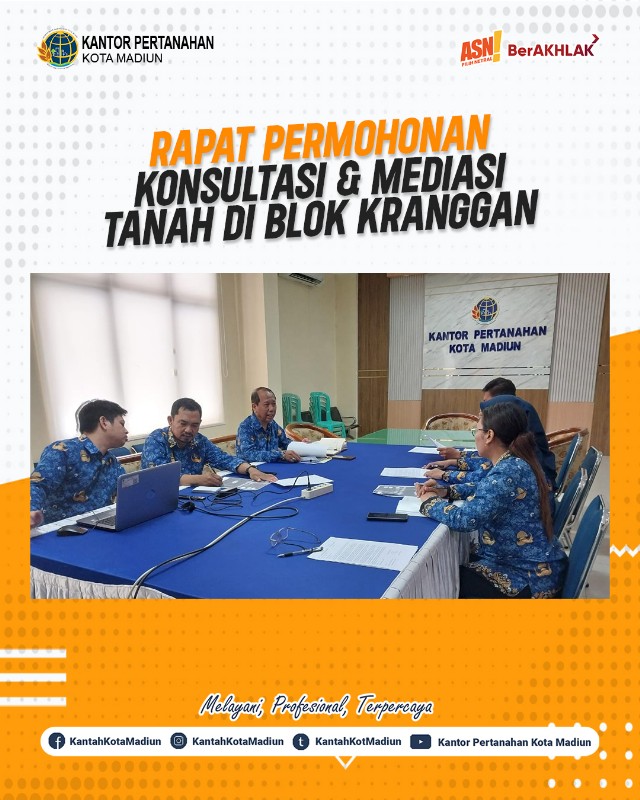 Halo #SobATRBPN, Hari ini Senin (17/03/2025) Kantor Pertanahan Kota Madiun mengikuti Rapat Permohonan Konsultasi dan Mediasi Tanah di Blok Kranggan. Turut hadir Kepala Seksi Survei dan Pemetaan, Kepala Seksi Penetapan Hak dan Pendaftaran, dan Kepala Seksi Pengadaan Tanah dan Pengembengan Kantor Pertanahan Kota Madiun.
