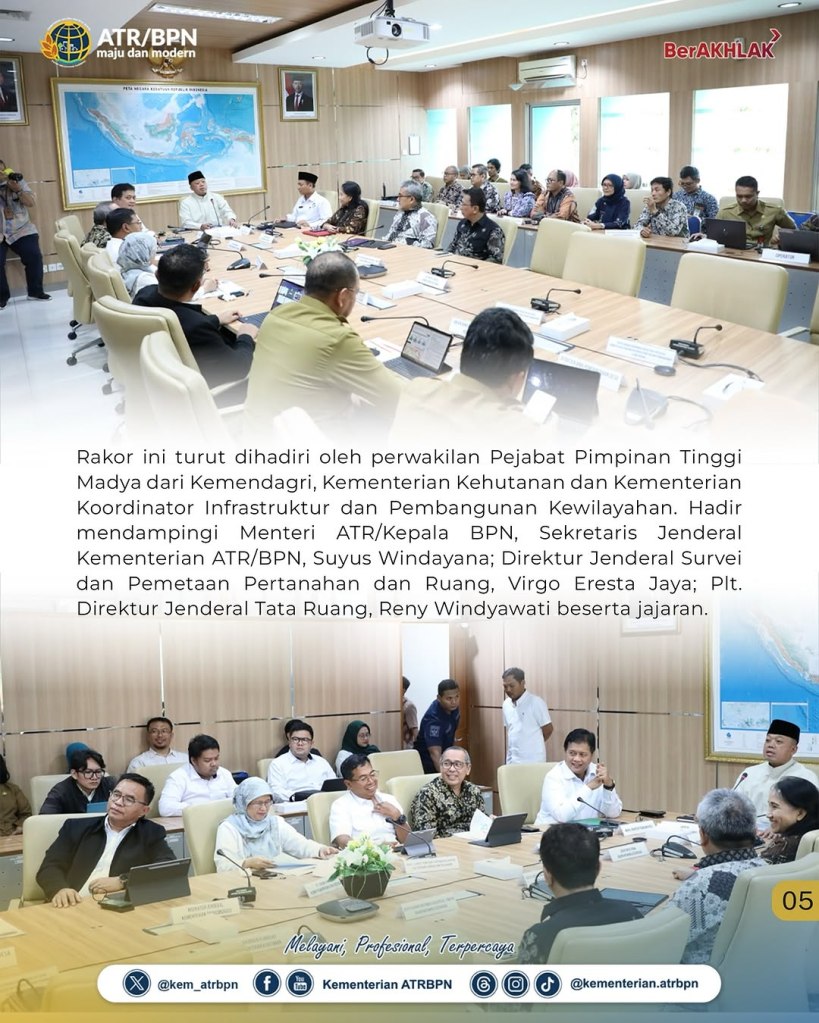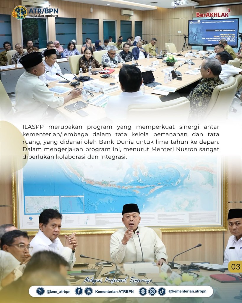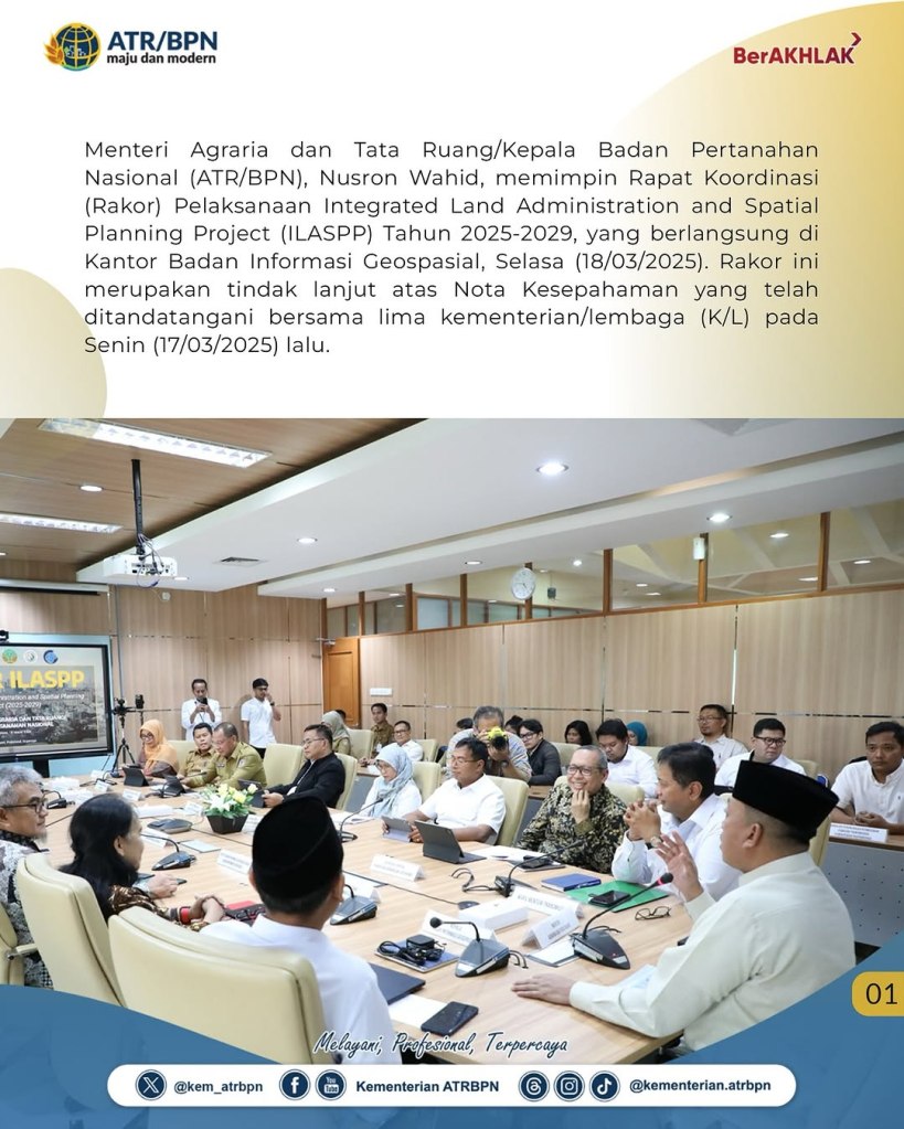 Menteri Agraria dan Tata Ruang/Kepala Badan Pertanahan Nasional (ATR/BPN), Nusron Wahid, memimpin Rapat Koordinasi (Rakor) Pelaksanaan Integrated Land Administration and Spatial Planning Project (ILASPP) Tahun 2025-2029. Rakor ini merupakan tindak lanjut atas Nota Kesepahaman yang telah ditandatangani bersama lima kementerian/lembaga (K/L) pada Senin (17/03/2025) lalu.