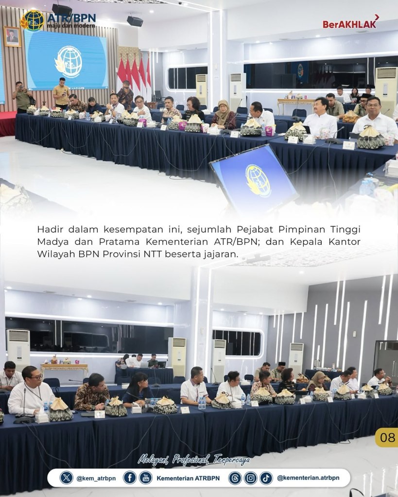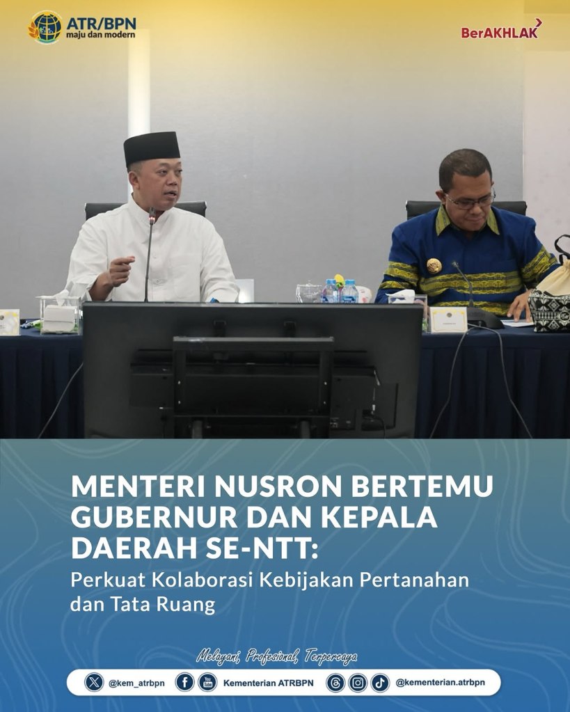 Menteri Agraria dan Tata Ruang/Kepala Badan Pertanahan Nasional (ATR/BPN), Nusron Wahid, mengadakan pertemuan dengan Gubernur Nusa Tenggara Timur (NTT), Emanuel Melkiades Laka Lena, para Bupati, dan Wali Kota se-NTT, di Kementerian ATR/BPN, Jakarta, Kamis (20/03/2025). Dalam pertemuan tersebut, Menteri Nusron menegaskan pentingnya kolaborasi antara pemerintah pusat dan daerah dalam kebijakan pertanahan, Reforma Agraria, Pengadaan Tanah, serta tata ruang.