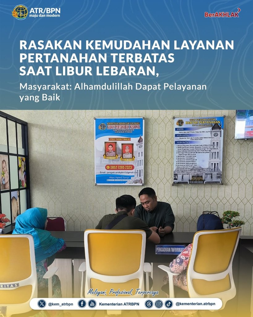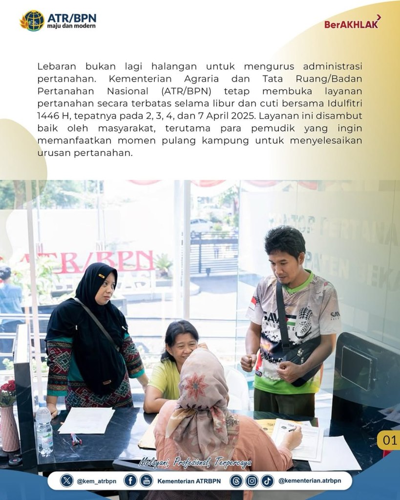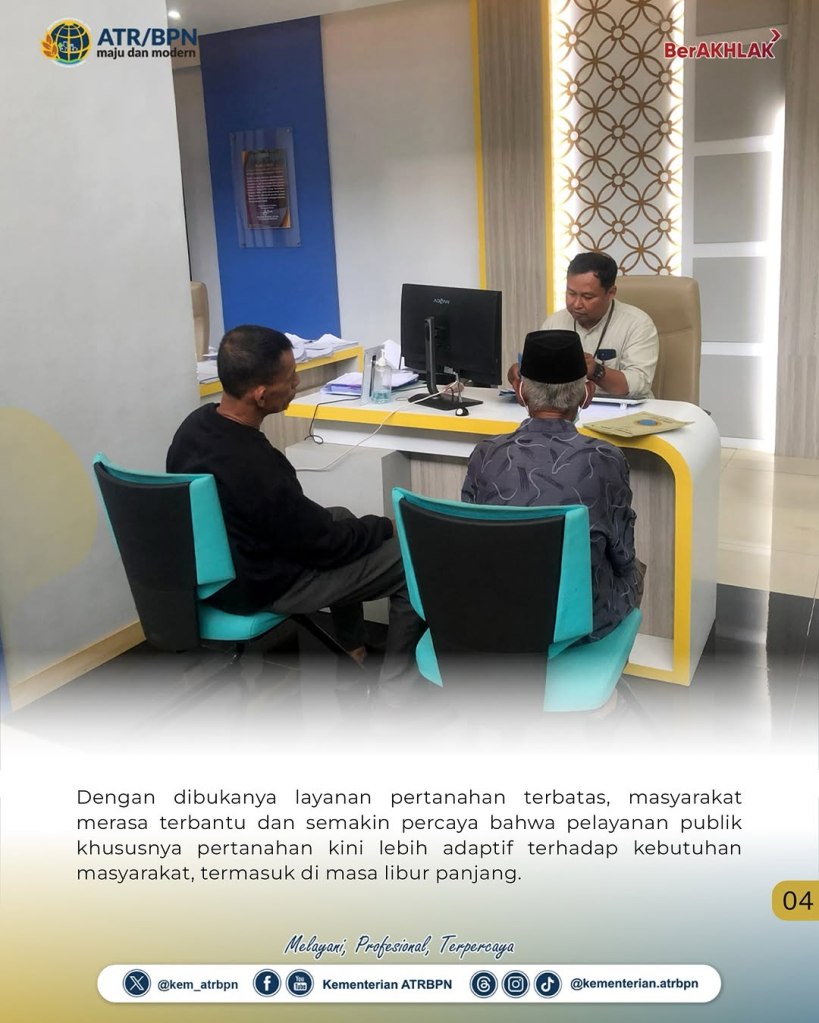 Kementerian Agraria dan Tata Ruang/Badan Pertanahan Nasional (ATR/BPN) tetap membuka layanan pertanahan secara terbatas selama libur dan cuti bersama Idulfitri 1446 H, tepatnya pada 2, 3, 4, dan 7 April 2025, lhoo…