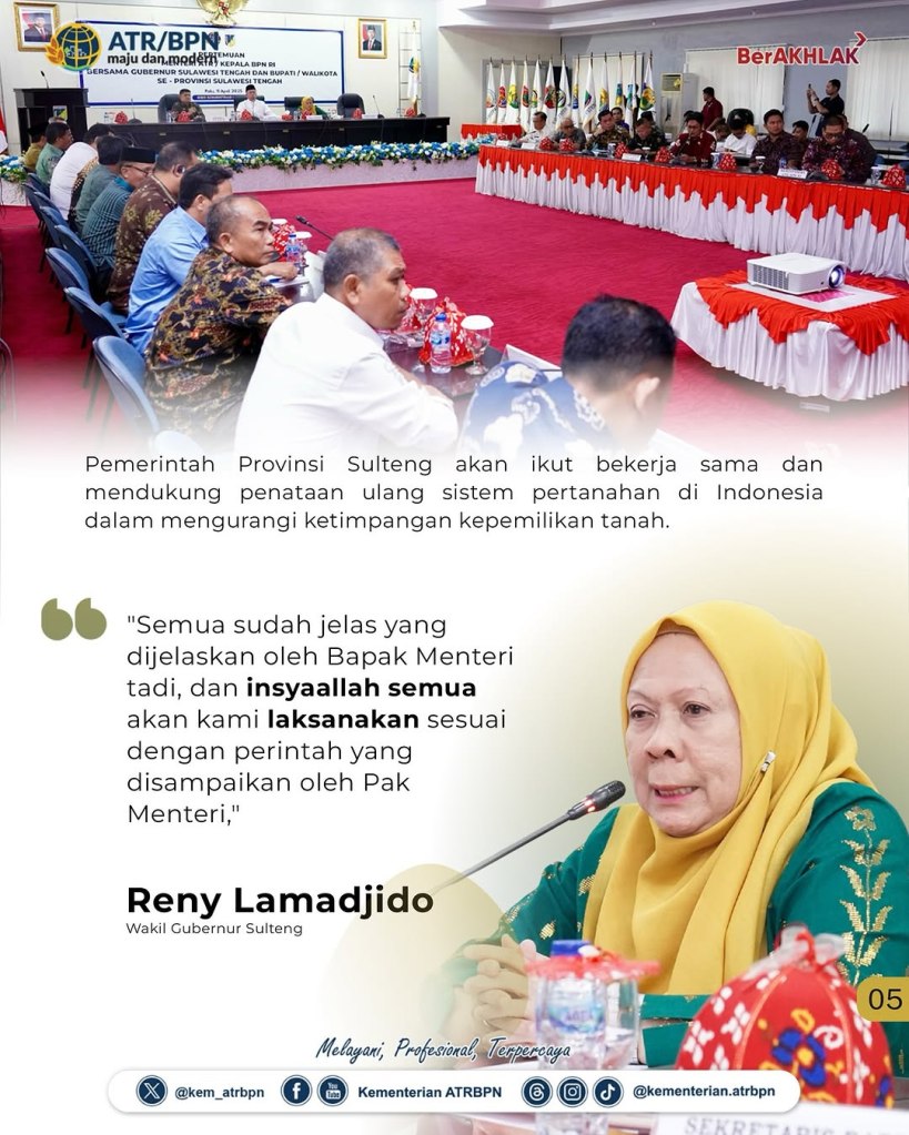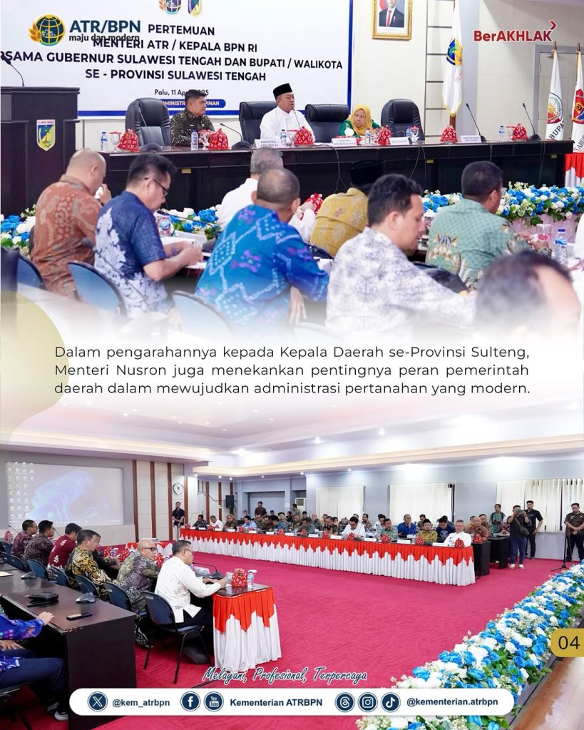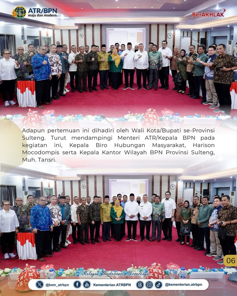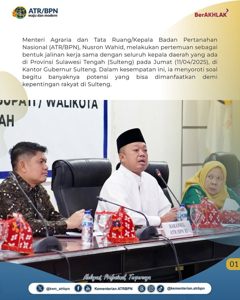 Pada Jumat (11/04/2025), Menteri Agraria dan Tata Ruang/Kepala Badan Pertanahan Nasional (ATR/BPN), Nusron Wahid, melakukan pertemuan sebagai bentuk jalinan kerja sama dengan seluruh kepala daerah yang ada di Provinsi Sulawesi Tengah (Sulteng). Ia menyoroti soal begitu banyaknya potensi yang bisa dimanfaatkan demi kepentingan rakyat di Sulteng ini.