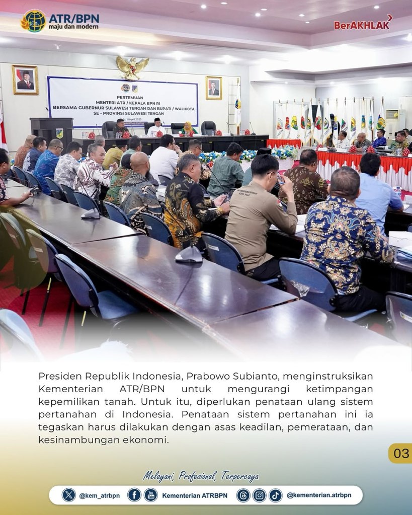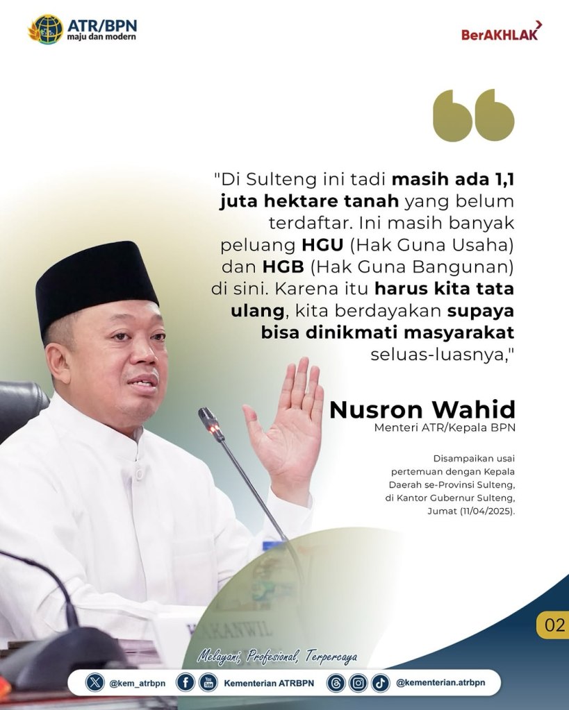 “Di Sulteng ini tadi masih ada 1,1 juta hektare tanah yang belum terdaftar. Ini masih banyak peluang HGU (Hak Guna Usaha) dan HGB (Hak Guna Bangunan) di sini. Karena itu harus kita tata ulang, kita berdayakan supaya bisa dinikmati masyarakat seluas-luasnya,” kata Menteri Nusron kepada awak media seusai pertemuan berlangsung di Kantor Gubernur Sulteng.