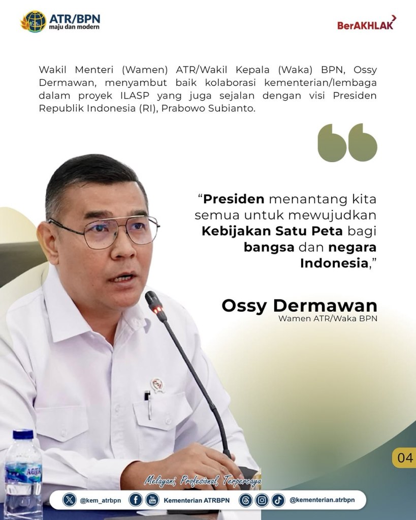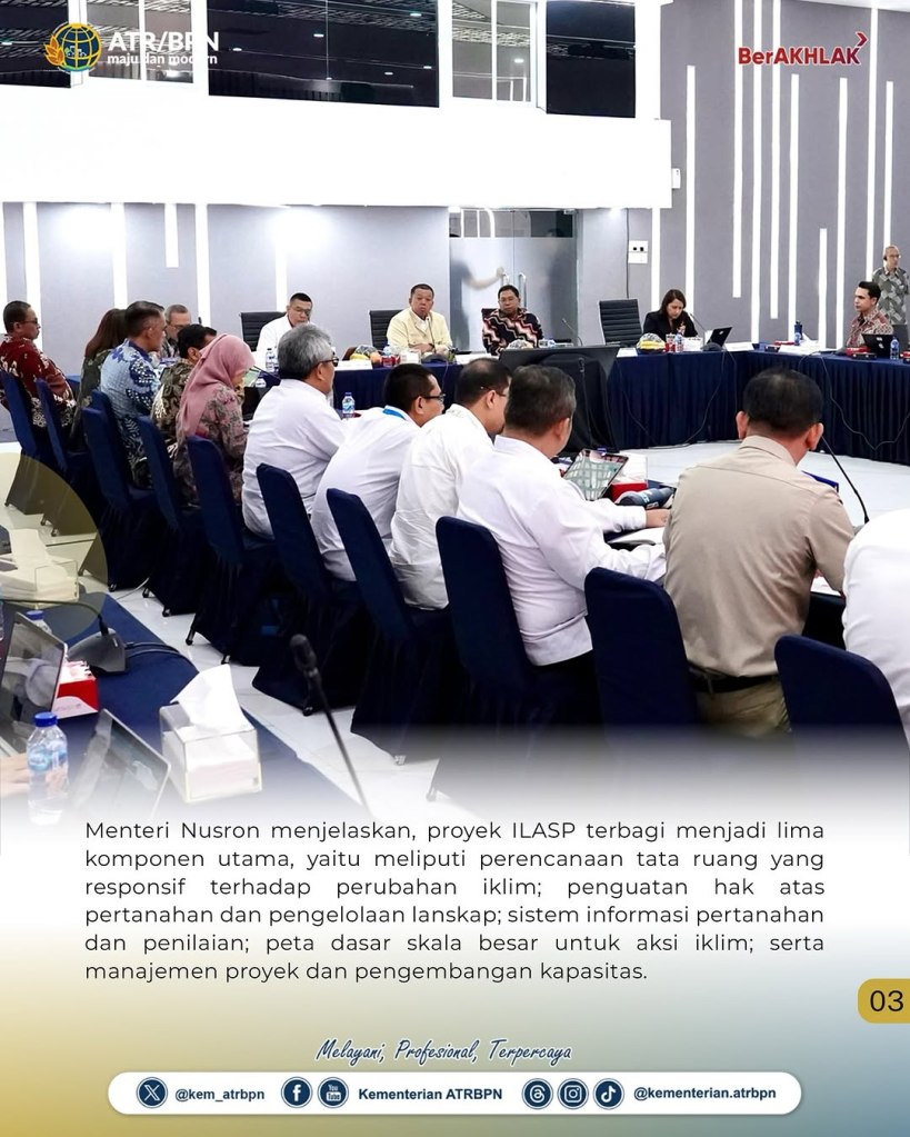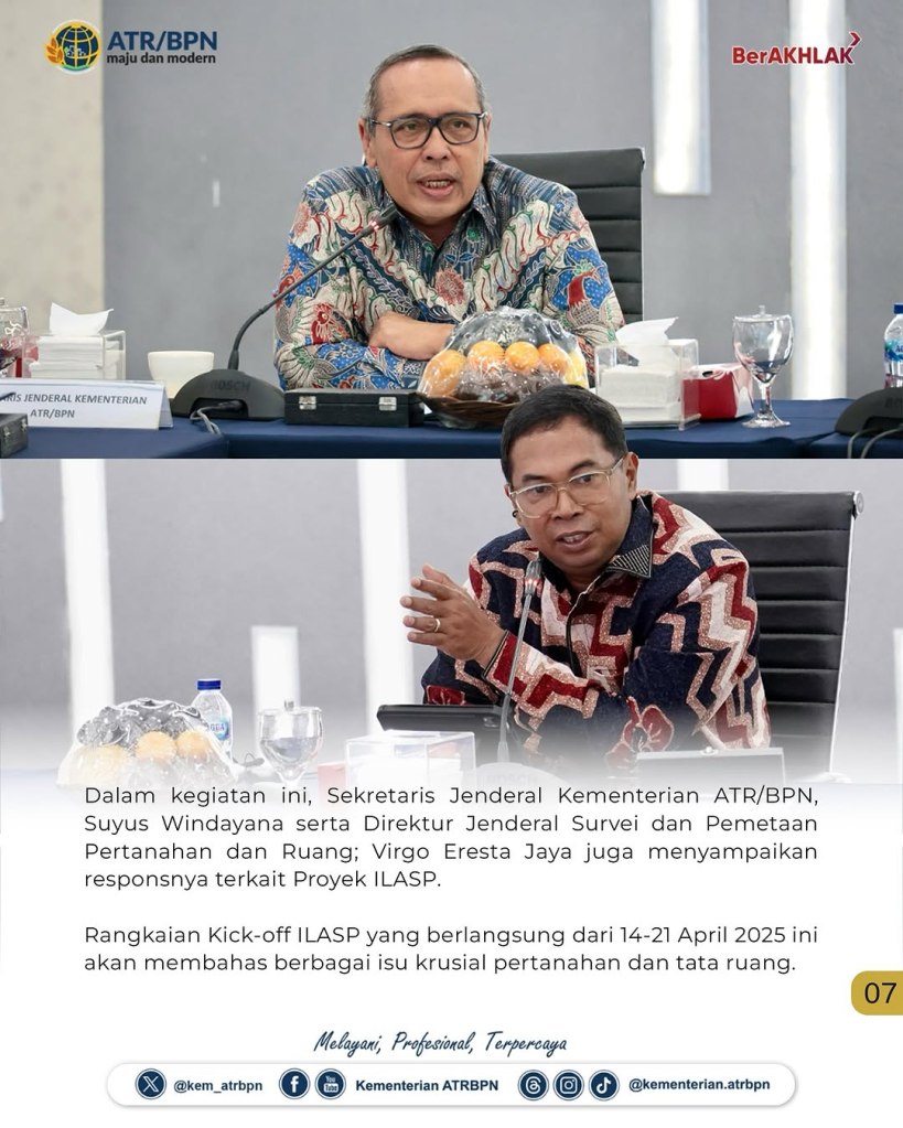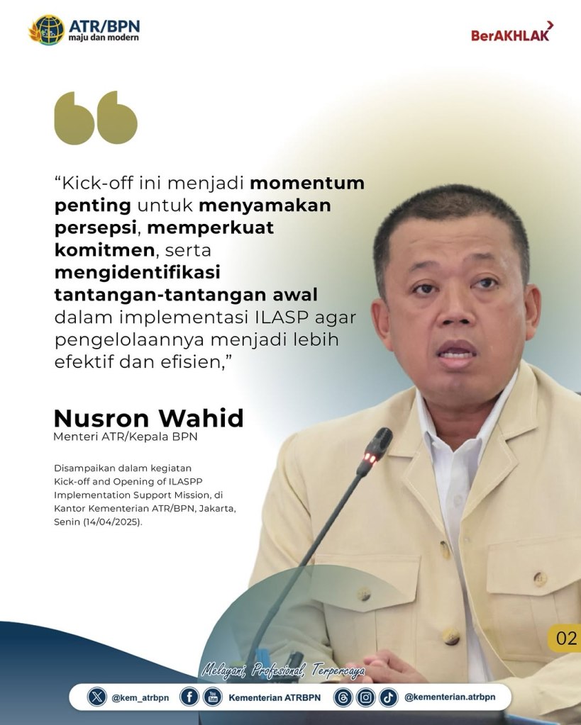 Menteri Agraria dan Tata Ruang/Kepala Badan Pertanahan Nasional (ATR/BPN), Nusron Wahid, membuka kegiatan Kick-off and Opening of Integrated Land Administration and Spatial Planning Project (ILASPP) Implementation Support Mission, di Kantor Kementerian ATR/BPN, Jakarta, Senin (14/04/2025). Dalam sambutannya, ia menekankan pentingnya kerja sama serta koordinasi antara kementerian dan lembaga untuk mencapai tujuan proyek.
