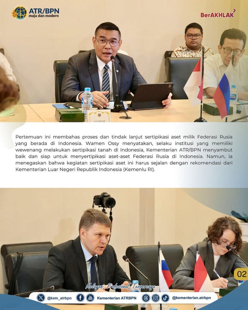 Halo #SobATRBPN, simak bersama yuk apa saja pembahasan dari pertemuan Wakil Menteri Agraria dan Tata Ruang/Wakil Kepala Badan Pertanahan Nasional (Wamen ATR/Waka BPN), Ossy Dermawan dengan Kepala Bidang Kerjasama pada Direktorat Administratif, Kantor Kepresidenan Federasi Rusia, Oleg Tikk, beserta jajarannya yang berlangsung pada Selasa (15/04/2025), di Kementerian ATR/BPN, Jakarta.