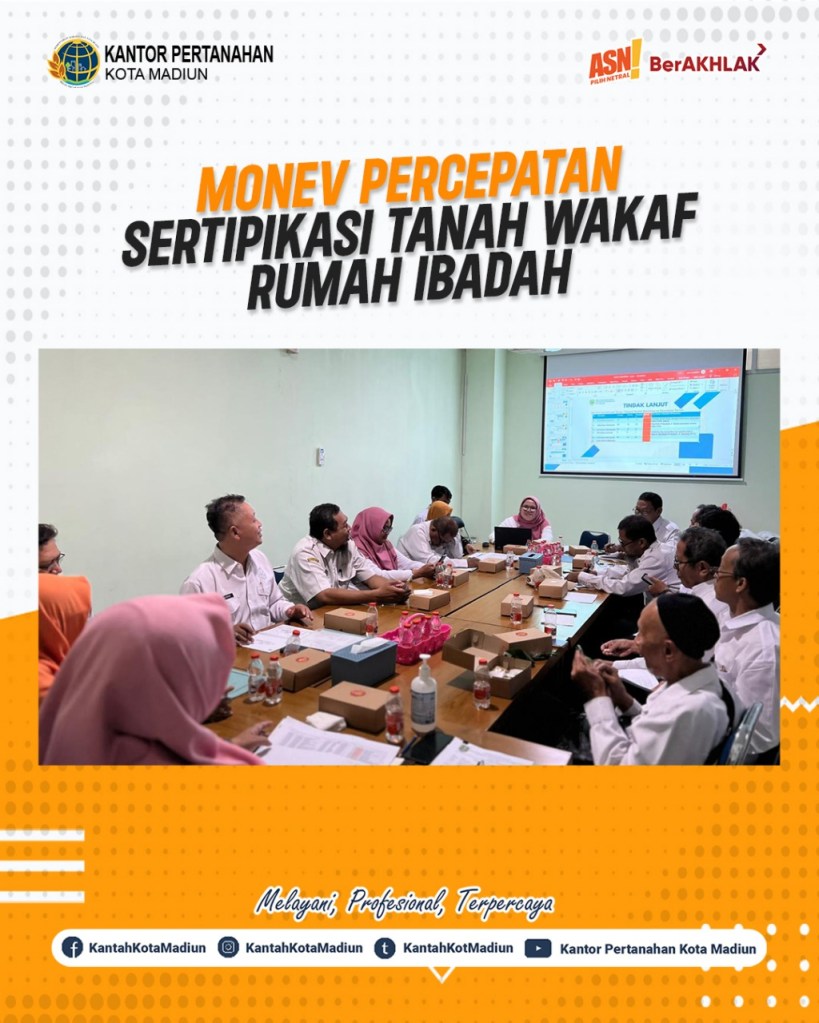 Halo #SobATRBPN, Hari ini Rabu (23/04/2025) Kantor Pertanahan Kota Madiun mengikuti monitoring dan evaluasi data yuridis atas alas hak bidang tanah untuk tempat ibadah dalam rangka percepatan sertipikat wakaf di Kelurahan Se Kecamatan Kartoharjo dan Se Kecamatan Taman.