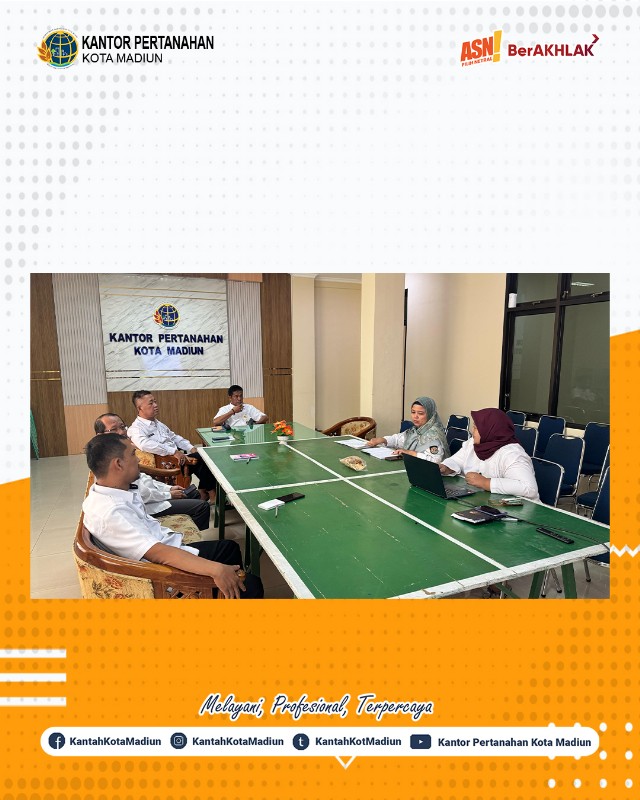Halo #SobATRBPN, Hari ini Rabu (23/04/2025) Kantor Pertanahan Kota Madiun melaksanakan Rapat Monitoring dan Evaluasi. Turut hadir Kepala Kantor Pertanahan Kota Madiun, Bapak Triawan Saleh, S.T., M.Si. dan diikuti oleh Seluruh Pejabat Pengawas Kantor Pertanahan Kota Madiun.