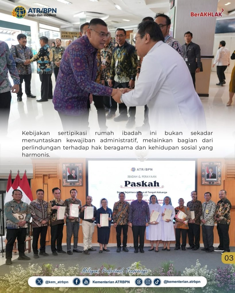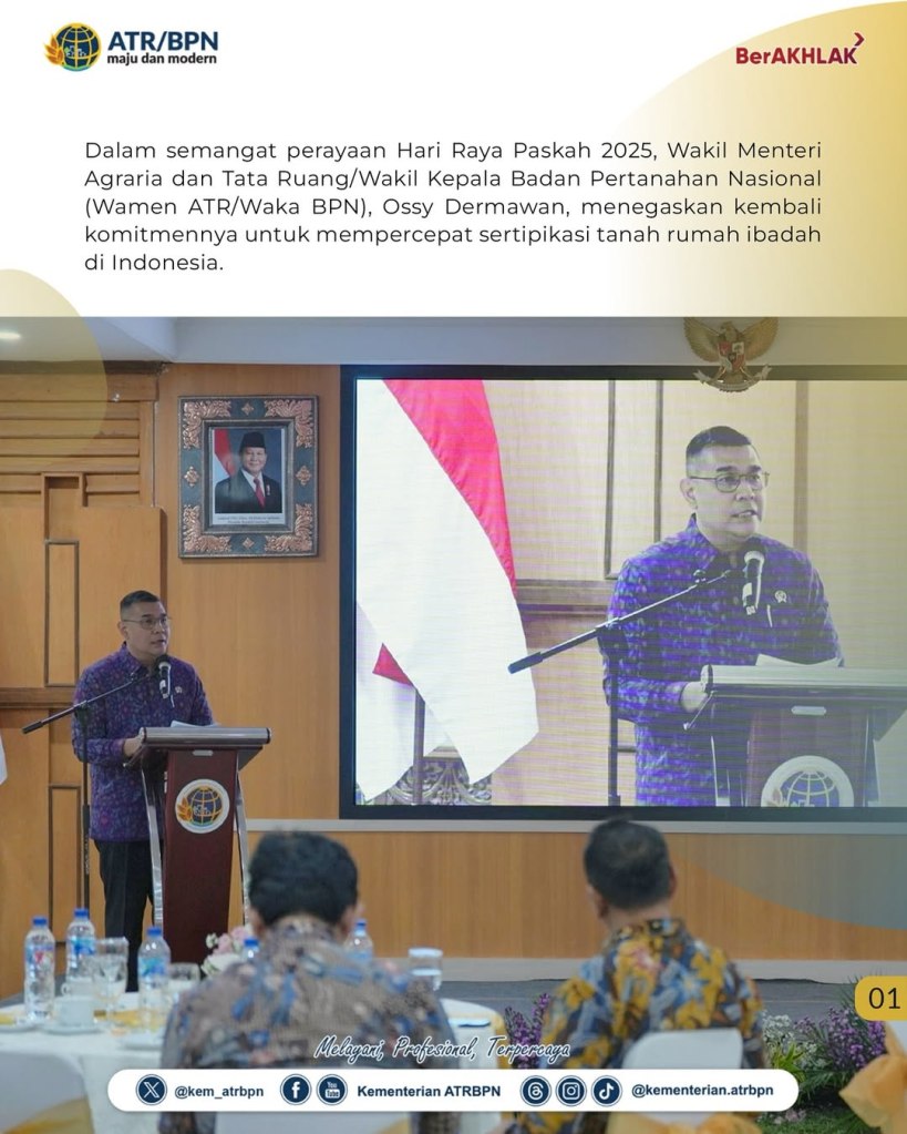 Dalam semangat perayaan Hari Raya Paskah 2025, Wakil Menteri Agraria dan Tata Ruang/Wakil Kepala Badan Pertanahan Nasional (Wamen ATR/Waka BPN), Ossy Dermawan, menegaskan kembali komitmennya untuk mempercepat sertipikasi tanah rumah ibadah di Indonesia. Kebijakan ini menjadi bagian dari upaya strategis Kementerian ATR/BPN dalam menjamin kepastian hukum dan mencegah konflik agraria yang kerap melibatkan aset keagamaan.