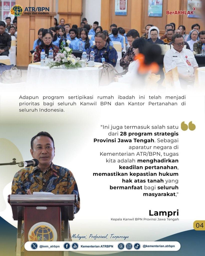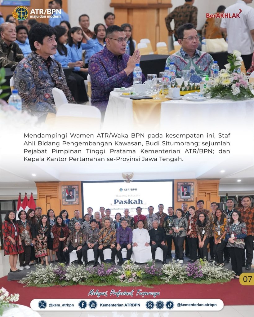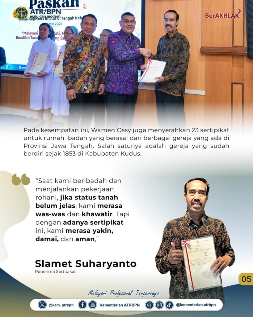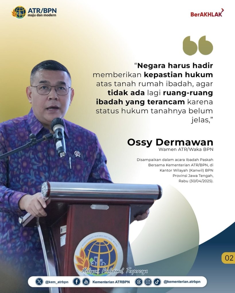 Ia menyatakan bahwa kehadiran negara dalam penyelesaian status tanah rumah ibadah adalah bagian dari tanggung jawab konstitusional. “Negara harus hadir memberikan kepastian hukum atas tanah rumah ibadah, agar tidak ada lagi ruang-ruang ibadah yang terancam karena status hukum tanahnya belum jelas,” kata Wamen Ossy saat pelaksanaan Ibadah Paskah Bersama Kementerian ATR/BPN, di Kantor Wilayah (Kanwil) BPN Provinsi Jawa Tengah, Rabu (30/04/2025).