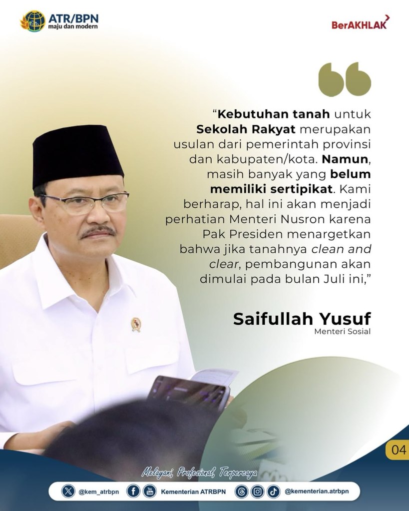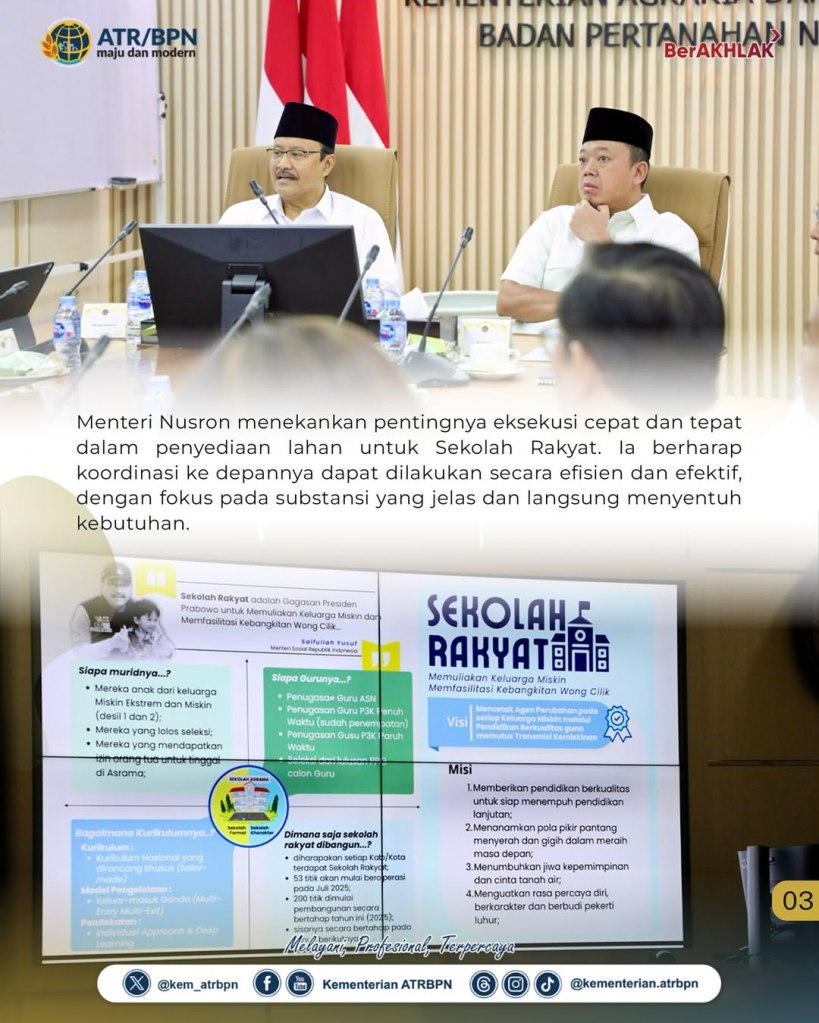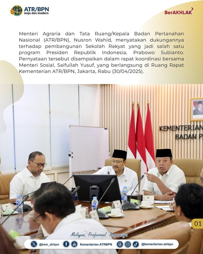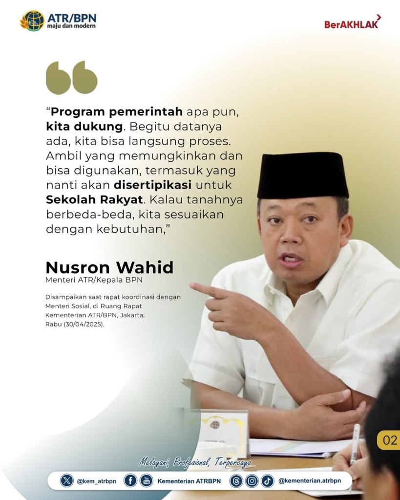Menteri Agraria dan Tata Ruang/Kepala Badan Pertanahan Nasional (ATR/BPN), Nusron Wahid, menyatakan dukungannya terhadap pembangunan Sekolah Rakyat yang jadi salah satu program Presiden Republik Indonesia, Prabowo Subianto. Pernyataan tersebut disampaikan dalam rapat koordinasi bersama Menteri Sosial, Saifullah Yusuf, yang berlangsung di Ruang Rapat Kementerian ATR/BPN, Jakarta, Rabu (30/04/2025).
