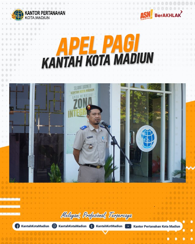 Halo #SobATRBPN, Hari ini Selasa (06/05/2025) Kantor Pertanahan Kota Madiun melaksanakan Apel Pagi yang bertempat di Halaman Depan Kantor Pertanahan Kota Madiun. Yang bertindak sebagai Pembina Upacara, Kepala Seksi Survei dan Pemetaan dan diikuti oleh seluruh Pejabat Pengawas dan Jajaran Kantor Pertanahan Kota Madiun.