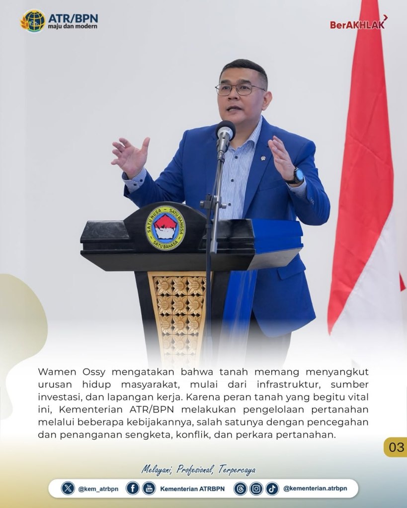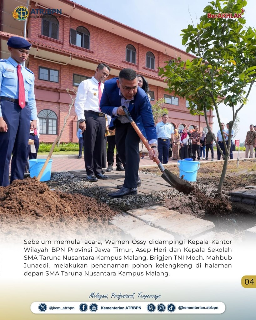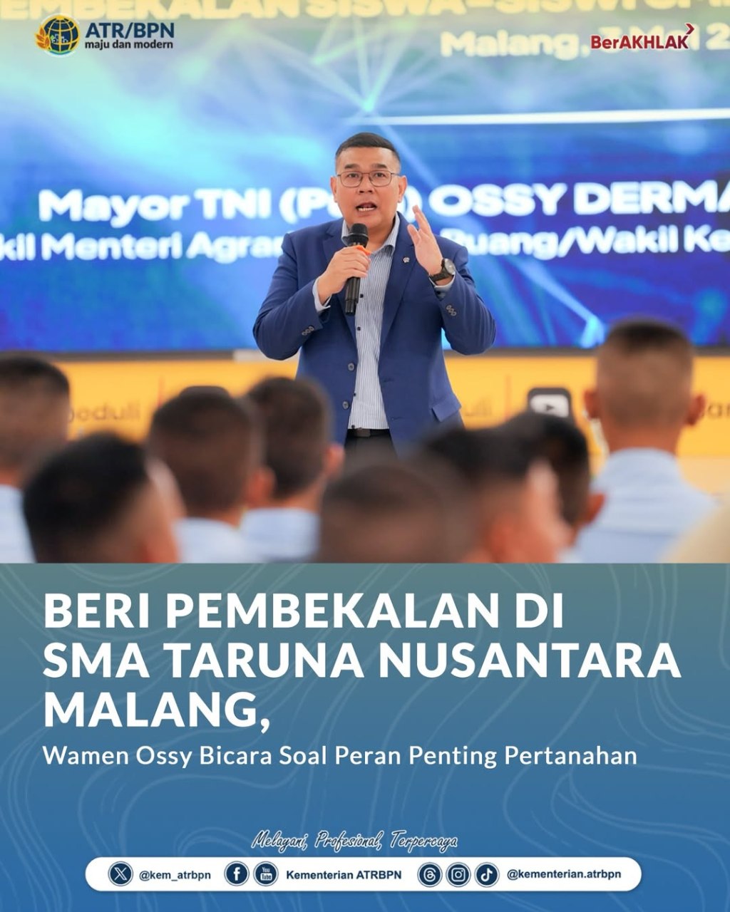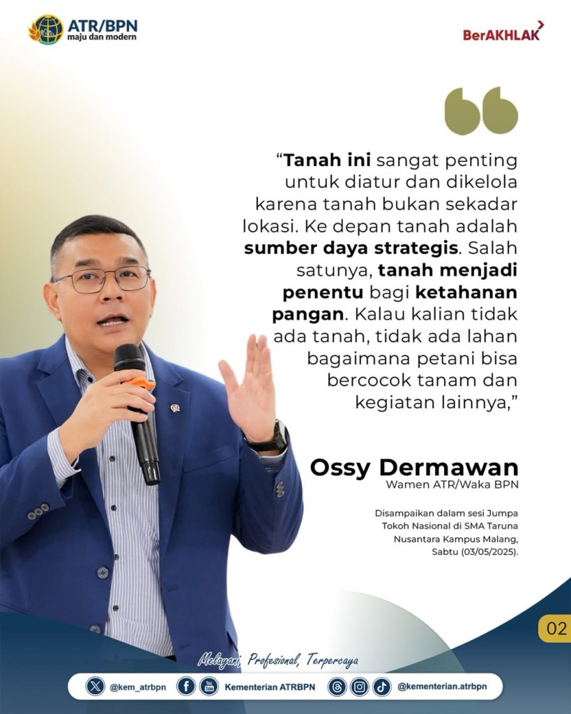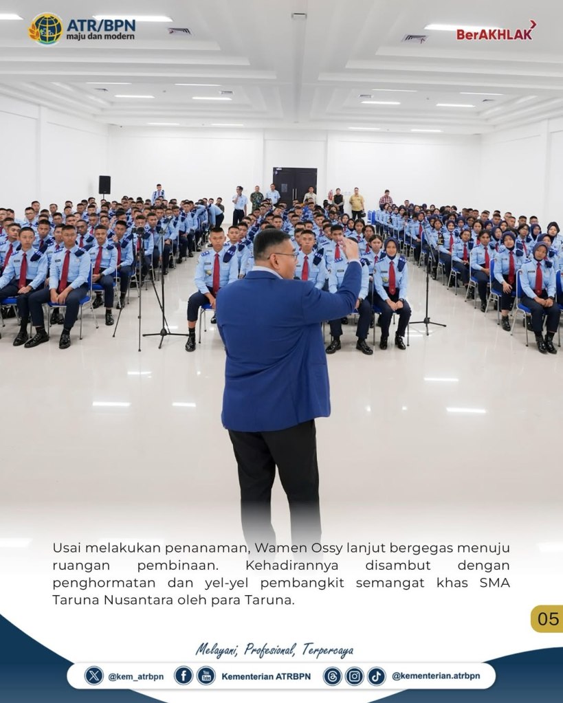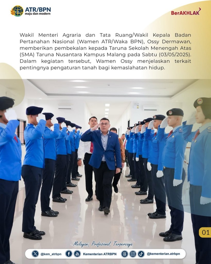 Wakil Menteri Agraria dan Tata Ruang/Wakil Kepala Badan Pertanahan Nasional (Wamen ATR/Waka BPN), Ossy Dermawan, memberikan pembekalan kepada Taruna Sekolah Menengah Atas (SMA) Taruna Nusantara Kampus Malang pada Sabtu (03/05/2025). Dalam kegiatan tersebut, Wamen Ossy menjelaskan terkait pentingnya pengaturan tanah bagi kemaslahatan hidup.