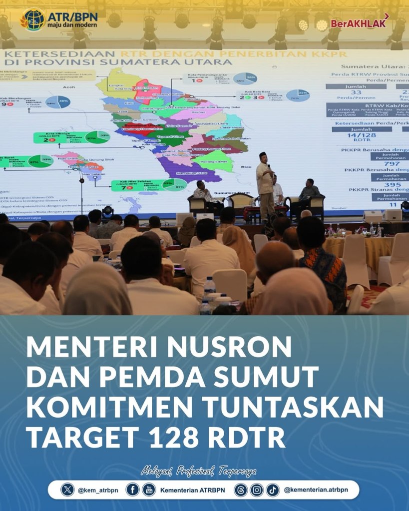 Kementerian Agraria dan Tata Ruang/Badan Pertanahan Nasional (ATR/BPN) bersama Pemerintah Daerah (Pemda) se-Sumatera Utara (Sumut) akan bekerja sama menuntaskan seluruh target Rencana Detail Tata Ruang (RDTR) di wilayah Sumut sebagai bagian dari target nasional. Komitmen itu disampaikan Menteri ATR/Kepala BPN, Nusron Wahid, dalam Rapat Koordinasi bersama Pemda se-Sumut pada Rabu (07/05/2025).