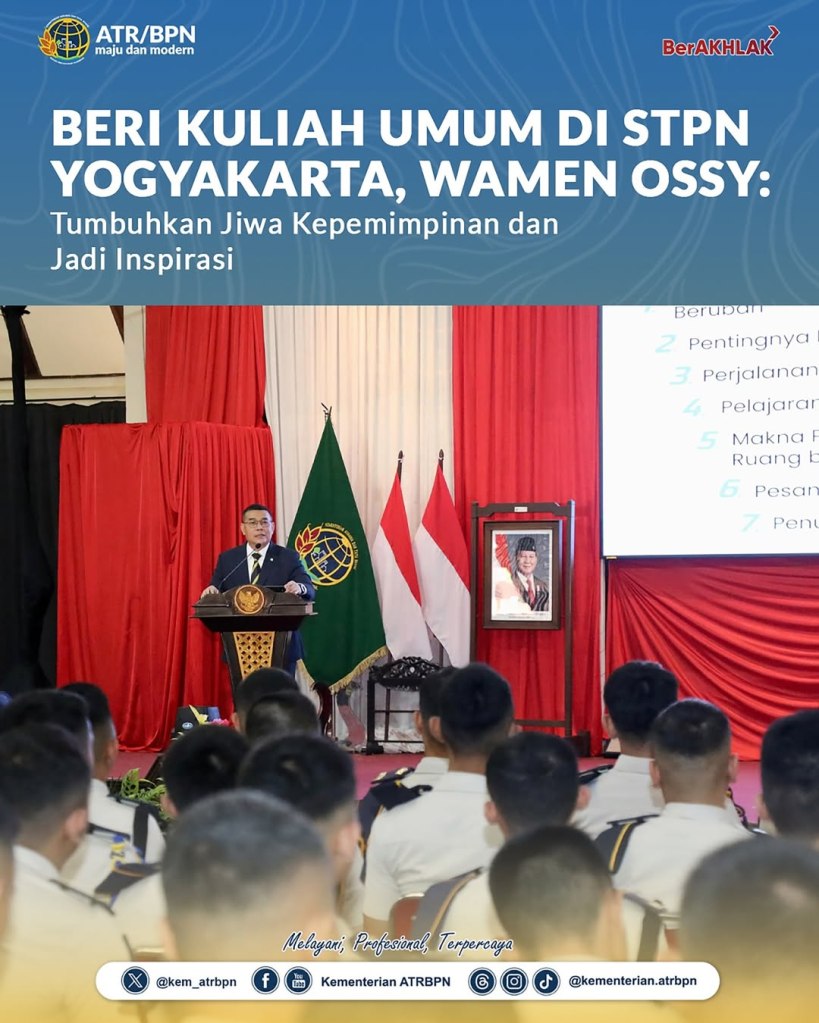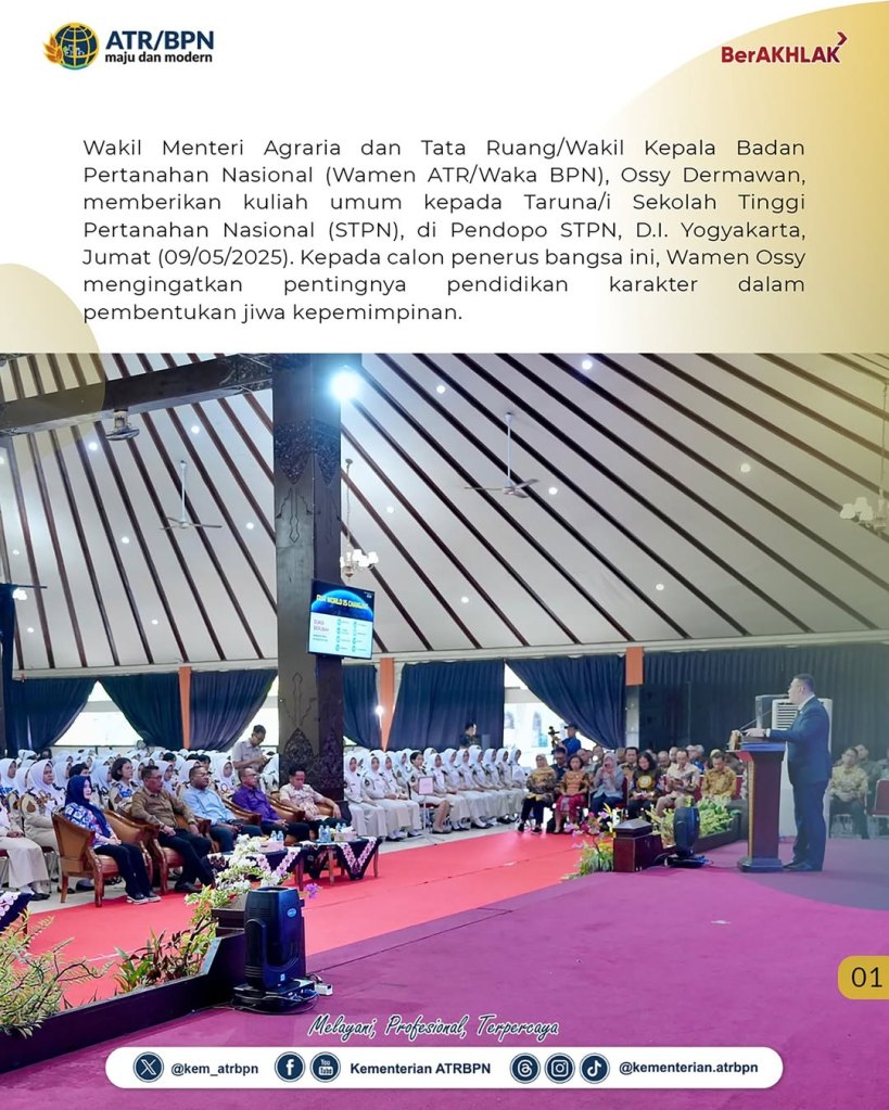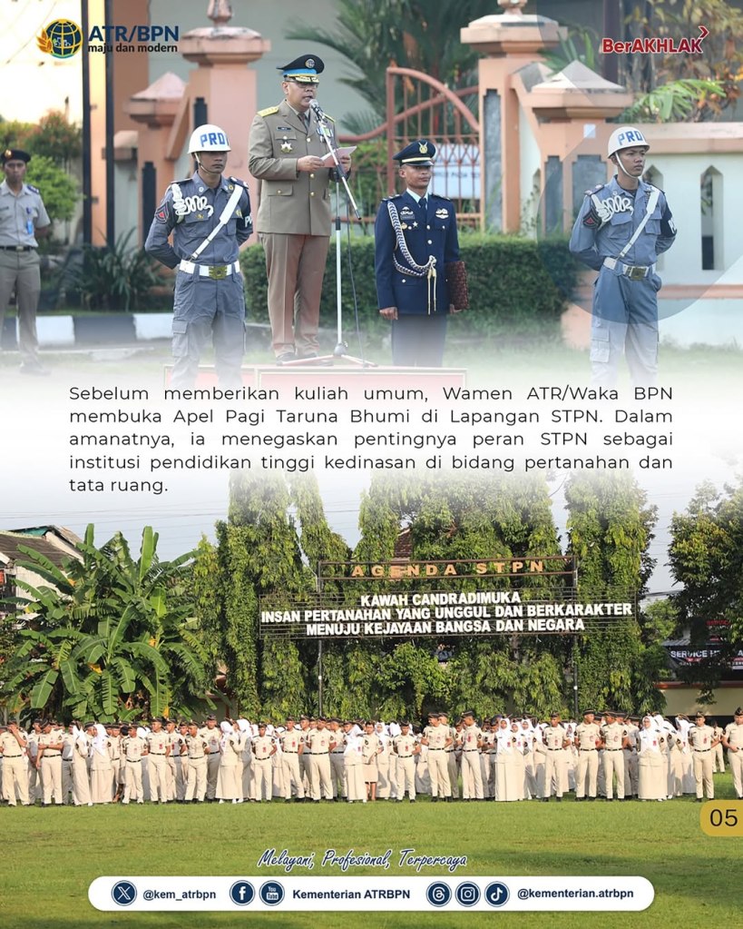 Wakil Menteri Agraria dan Tata Ruang/Wakil Kepala Badan Pertanahan Nasional (Wamen ATR/Waka BPN), Ossy Dermawan, membuka acara Apel Pagi Taruna Bhumi pada Jumat (09/05/2025) di Sekolah Tinggi Pertanahan Nasional (STPN), D.I. Yogyakarta. Dalam amanatnya, Wamen Ossy menegaskan pentingnya peran STPN sebagai institusi pendidikan tinggi kedinasan di bidang pertanahan dan tata ruang.