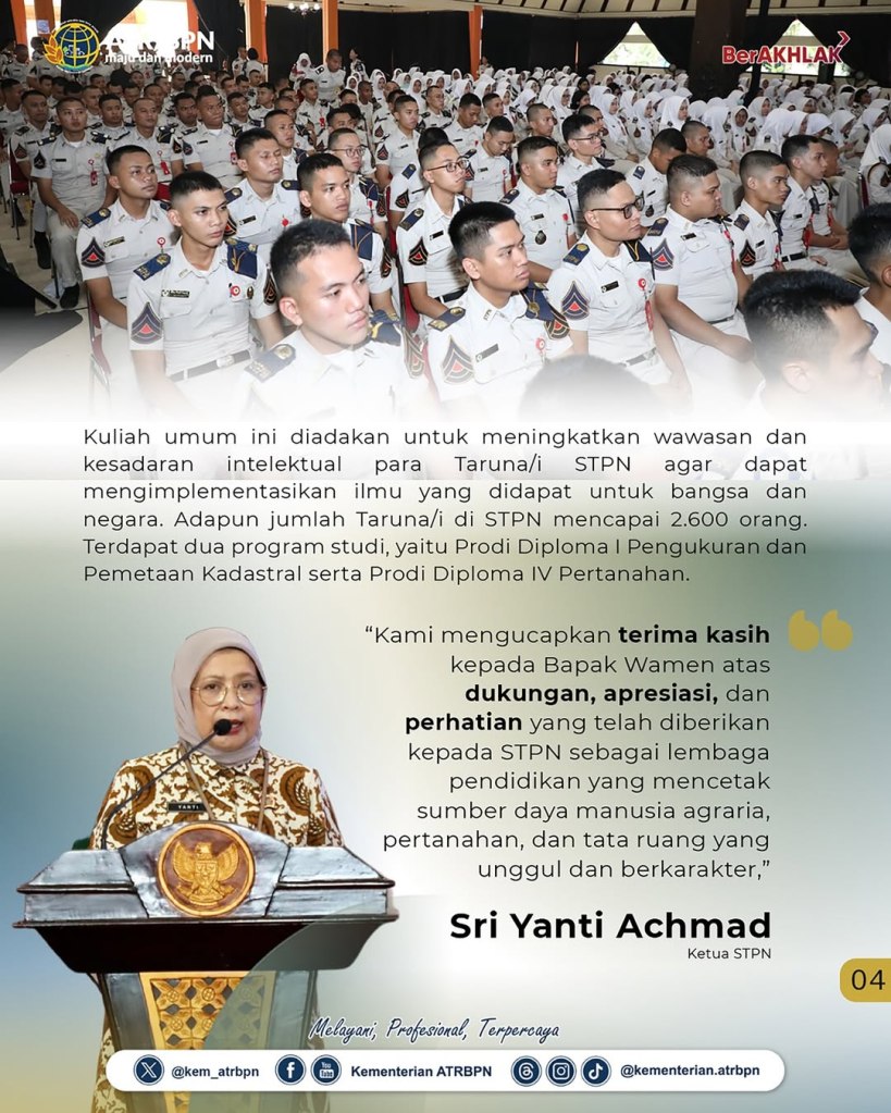 “Sebagai institusi pendidikan tinggi kedinasan di bidang pertanahan dan tata ruang, STPN diharapkan tidak hanya mencetak lulusan yang kompeten secara akademis, tetapi juga membentuk insan pertanahan dan tata ruang yang berkarakter, berintegritas, dan berjiwa nasionalis. Hal ini diwujudkan dalam Sapta Karakter Taruna Bhumi, tujuh karakter utama yang menjadi fondasi moral dan etika bagi setiap Taruna/i STPN,” ujar Wamen Ossy.