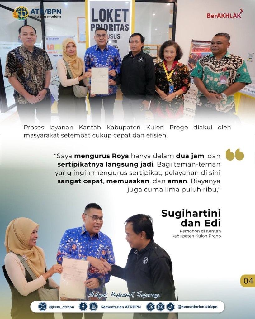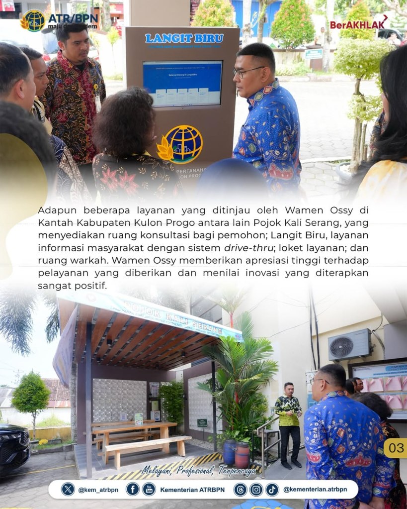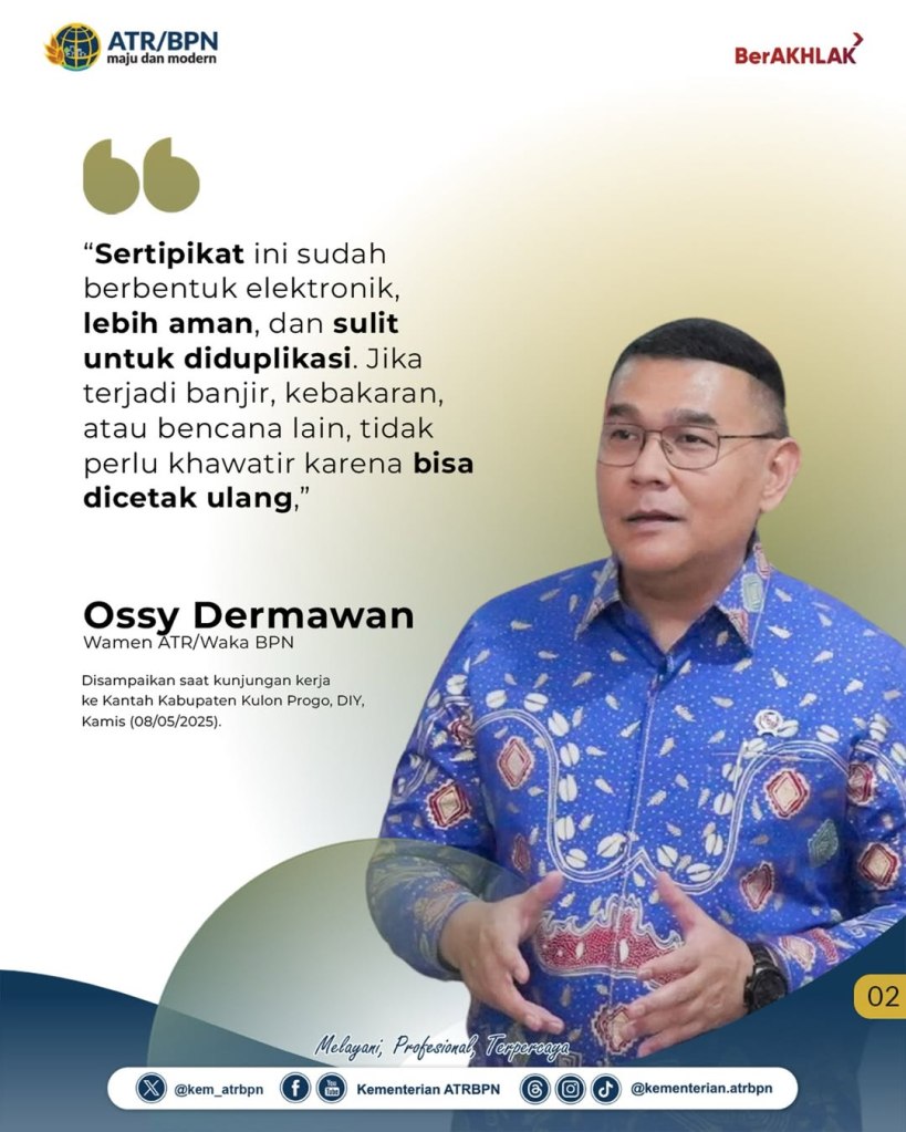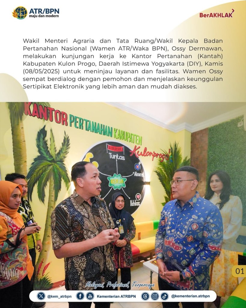 Wakil Menteri Agraria dan Tata Ruang/Wakil Kepala Badan Pertanahan Nasional (Wamen ATR/Waka BPN), Ossy Dermawan, melakukan kunjungan kerja ke Kantor Pertanahan (Kantah) Kabupaten Kulon Progo, Daerah Istimewa Yogyakarta (DIY), Kamis (08/05/2025) untuk meninjau layanan dan fasilitas. Wamen Ossy sempat berdialog dengan pemohon dan menjelaskan keunggulan Sertipikat Elektronik yang lebih aman dan mudah diakses.