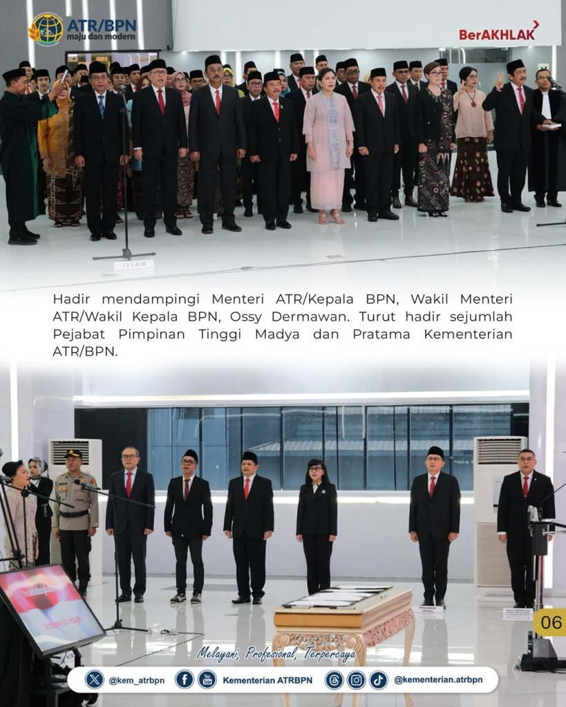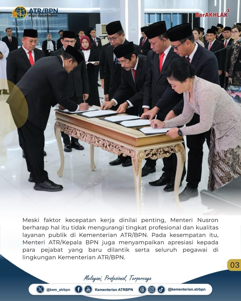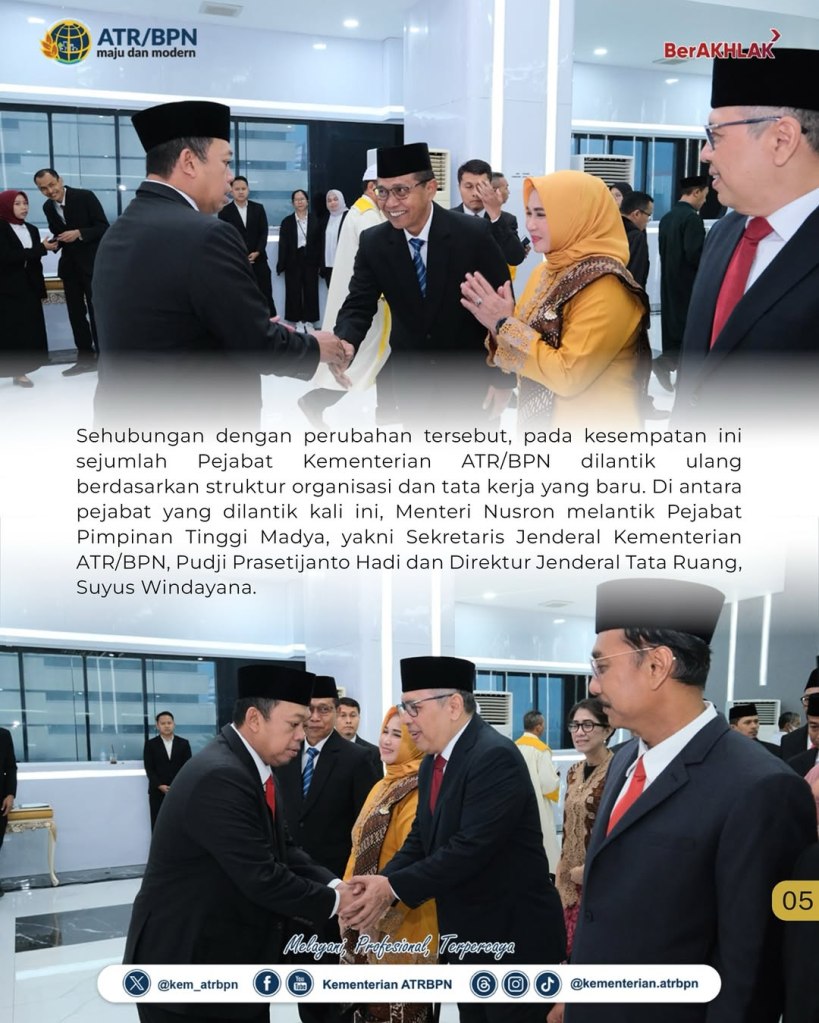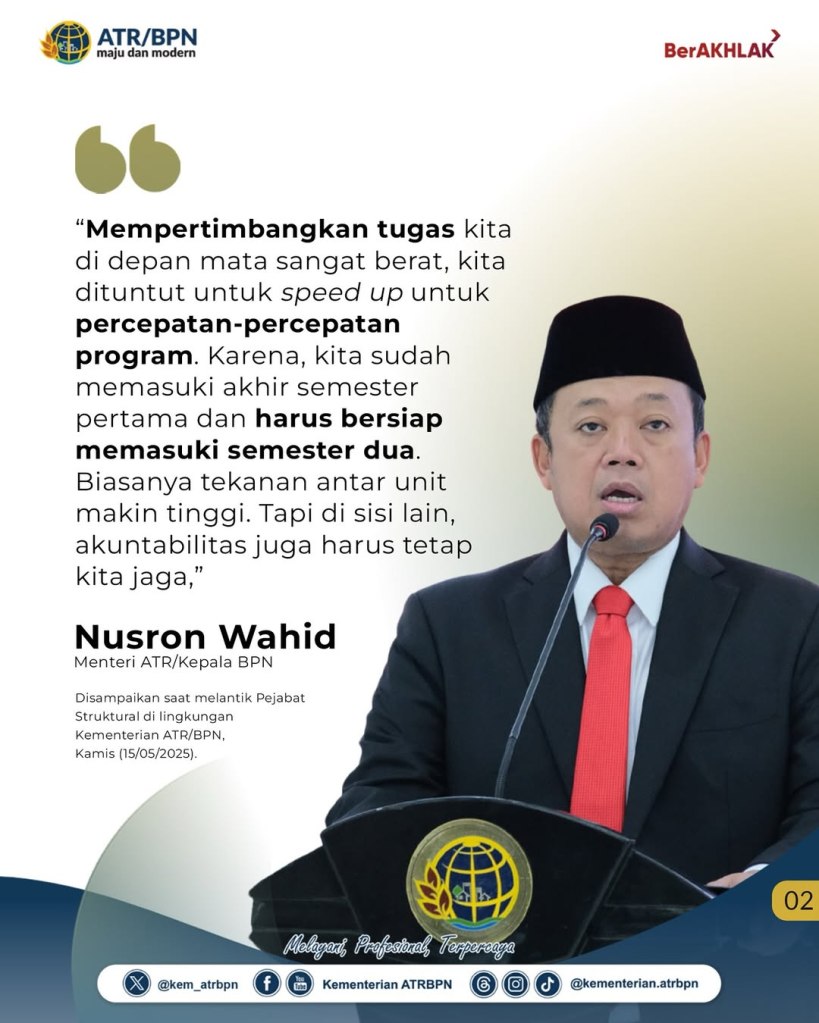 Menteri Agraria dan Tata Ruang/Kepala Badan Pertanahan Nasional (ATR/BPN), Nusron Wahid, melantik Pejabat Struktural di lingkungan Kementerian ATR/BPN pada Kamis (15/05/2025). Ia menginginkan jajarannya mempercepat pelaksanaan program kerja yang diemban di tengah tuntutan tugas berat pada masa mendatang.