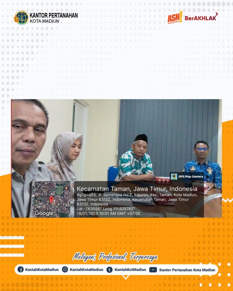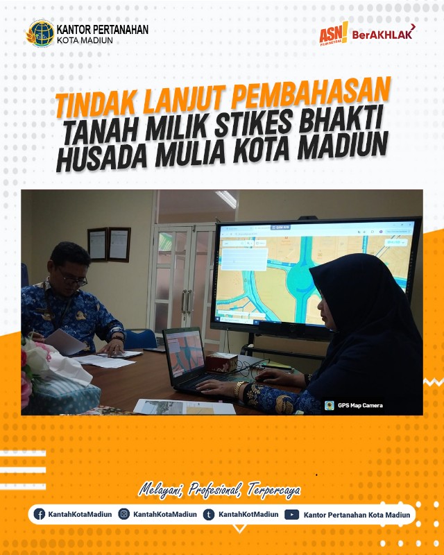 Halo #SobATRBPN, Hari ini Senin (19/05/2025) Kantor Pertanahan Kota Madiun mengikuti rapat tindaklanjut pembahasan Tanah Milik Sekolah Tinggi Ilmu Kesehatan Bhakti Husada Mulia Kota Madiun yang bertempat di Ruang Rapat Kantor BKAD Kota Madiun, Jl Semangka No.2 Madiun.