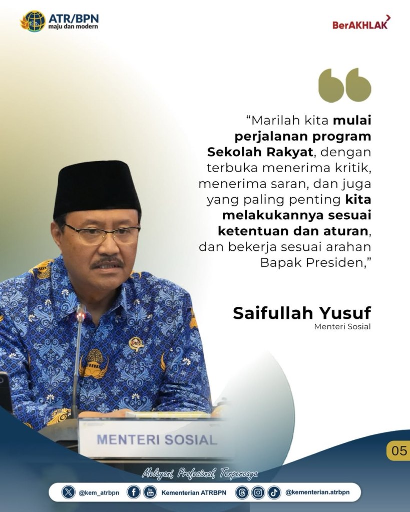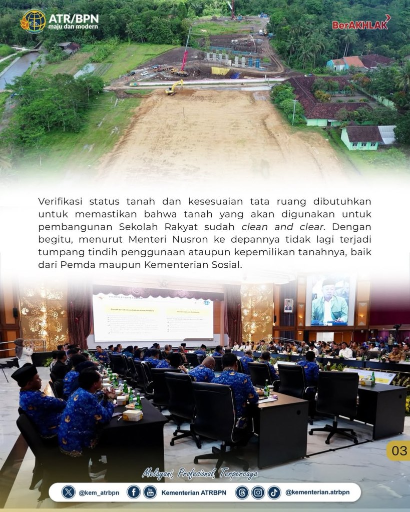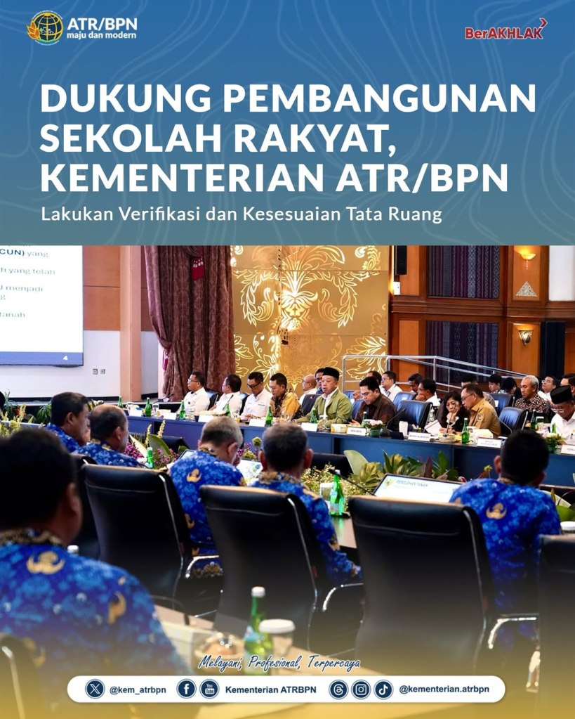 Menteri Agraria dan Tata Ruang/Kepala Badan Pertanahan Nasional (ATR/BPN), Nusron Wahid, menegaskan komitmennya dalam mendukung proses pembangunan Sekolah Rakyat yang digagas oleh Presiden Republik Indonesia (RI), Prabowo Subianto. Ia mengungkapkan, Kementerian ATR/BPN saat ini tengah melakukan verifikasi status kepemilikan tanah dan memastikan kesesuaian tata ruang.