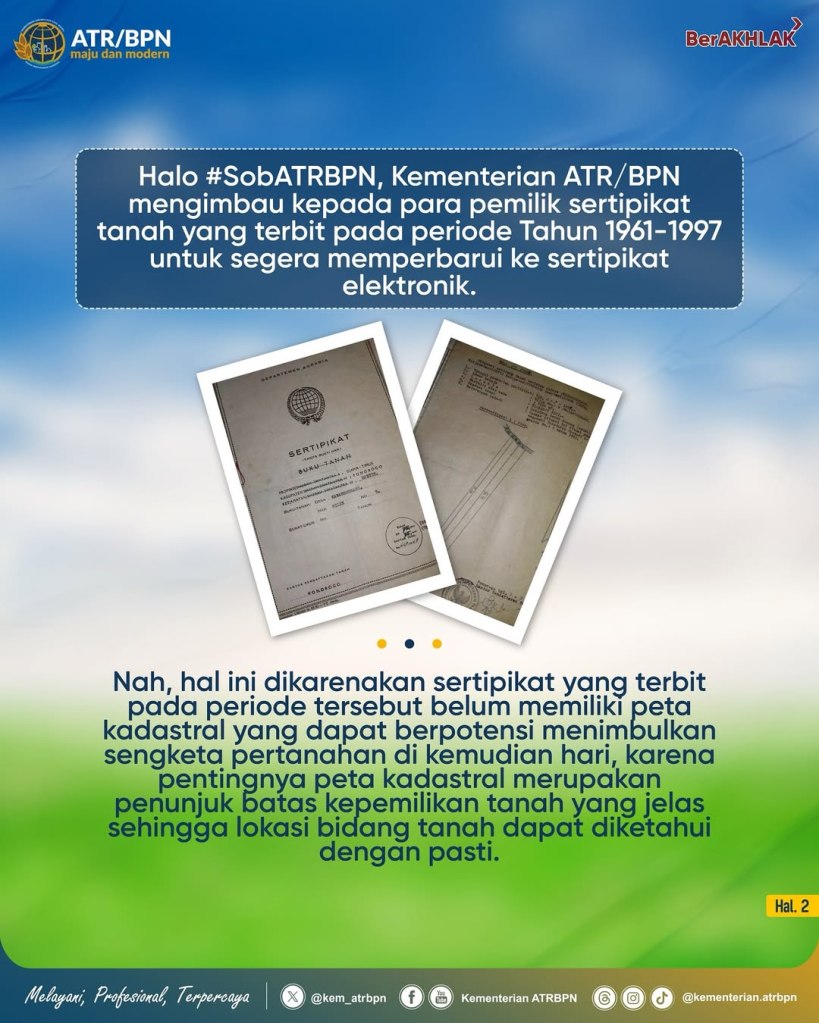 Halo #SobATRBPN, Kementerian ATR/BPN mengimbau kepada para pemilik sertipikat tanah yang terbit pada periode Tahun 1961-1997 untuk segera memperbarui ke sertipikat elektronik.