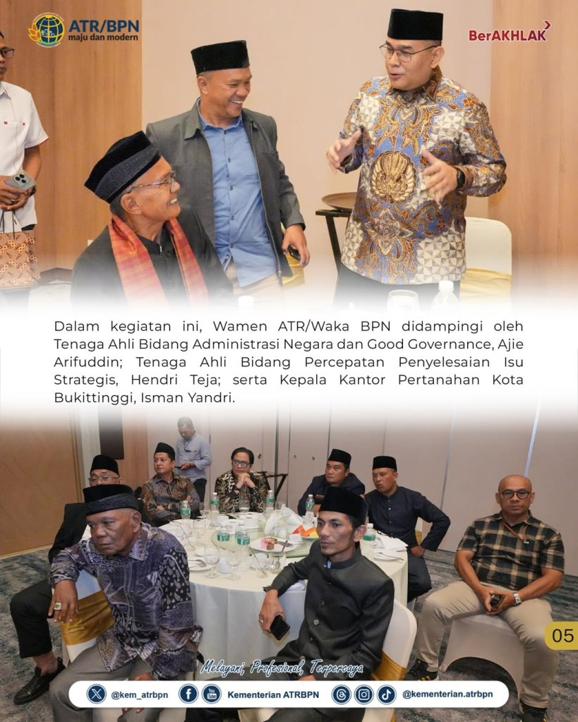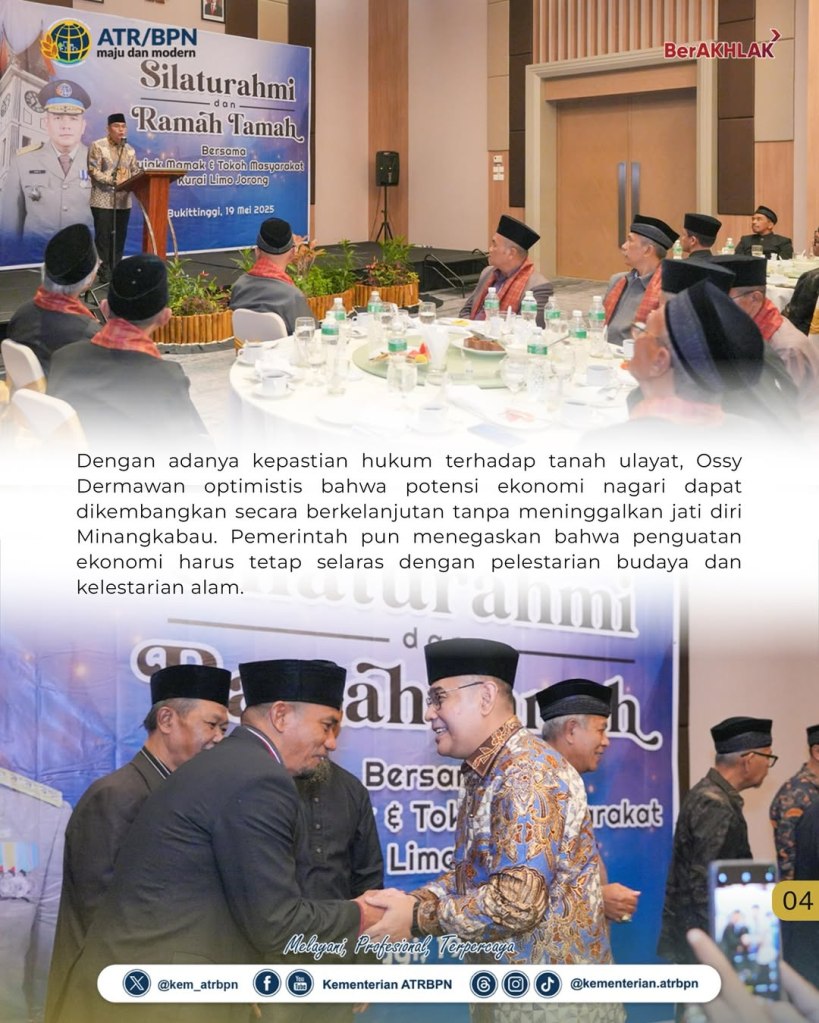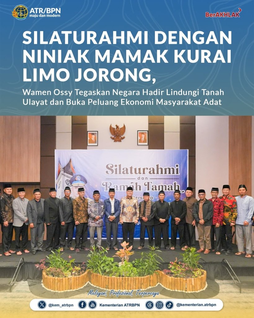 Wakil Menteri Agraria dan Tata Ruang/Wakil Kepala Badan Pertanahan Nasional (Wamen ATR/Waka BPN), Ossy Dermawan, melakukan silaturahmi dengan para Niniak Mamak Kurai Limo Jorong, dalam kunjungannya ke Kota Bukittinggi, Senin (19/05/2025). Pada pertemuan tersebut, ia menegaskan bahwa sertipikasi tanah ulayat di Provinsi Sumatera Barat merupakan bentuk nyata kehadiran negara dalam melindungi hak masyarakat hukum adat.