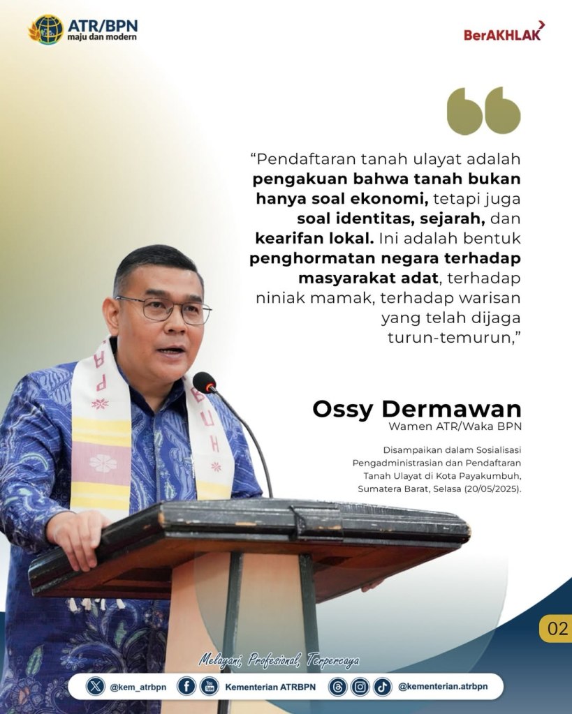 Wakil Menteri Agraria dan Tata Ruang/Wakil Kepala Badan Pertanahan Nasional (Wamen ATR/Waka BPN), Ossy Dermawan, menyosialisasikan program Pengadministrasian dan Pendaftaran Tanah Ulayat di Kota Payakumbuh, Sumatera Barat, Selasa (20/05/2025). Dalam sambutannya, ia menegaskan bahwa pendaftaran tanah ulayat bukan sekadar upaya administrasi, melainkan wujud nyata penghormatan negara terhadap nilai-nilai adat dan tradisi yang hidup di tengah masyarakat.