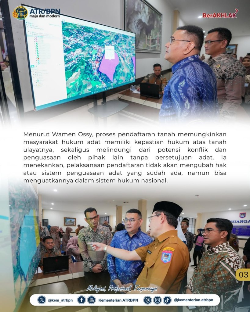 “Pendaftaran tanah ulayat adalah pengakuan bahwa tanah bukan hanya soal ekonomi, tetapi juga soal identitas, sejarah, dan kearifan lokal. Ini adalah bentuk penghormatan negara terhadap masyarakat adat, terhadap niniak mamak, terhadap warisan yang telah dijaga turun-temurun,” ujar Ossy Dermawan pada kegiatan yang berlangsung di Kota Payakumbuh, Sumatera Barat, Selasa (20/05/2025).