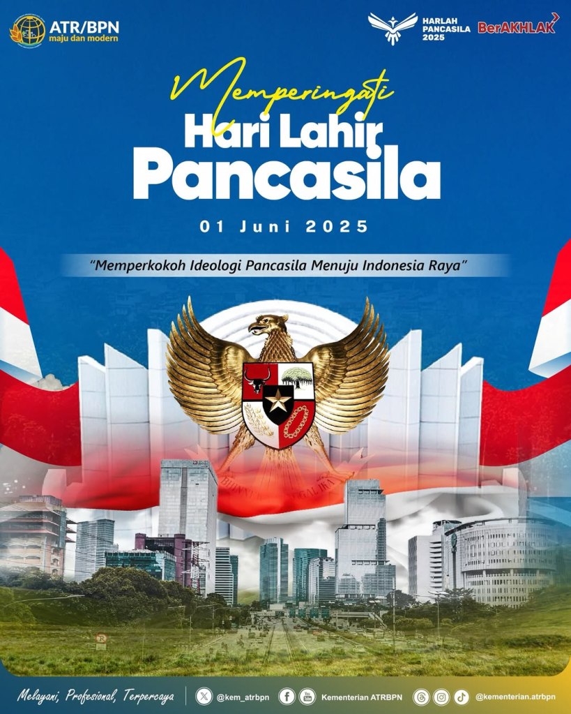 Segenap jajaran Kementerian ATR/BPN mengucapkan Selamat Memperingati Hari Lahir Pancasila, 1 Juni 2025.