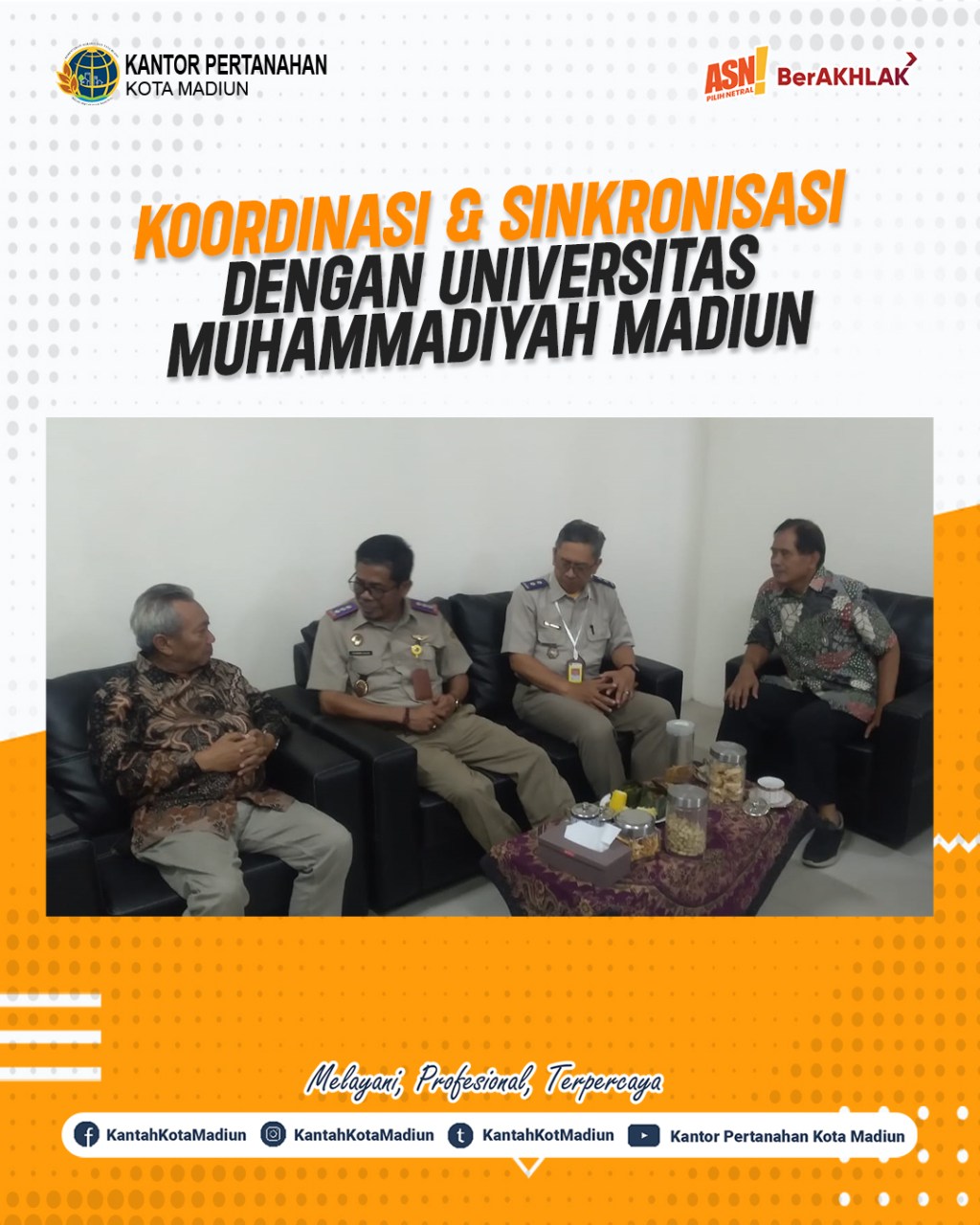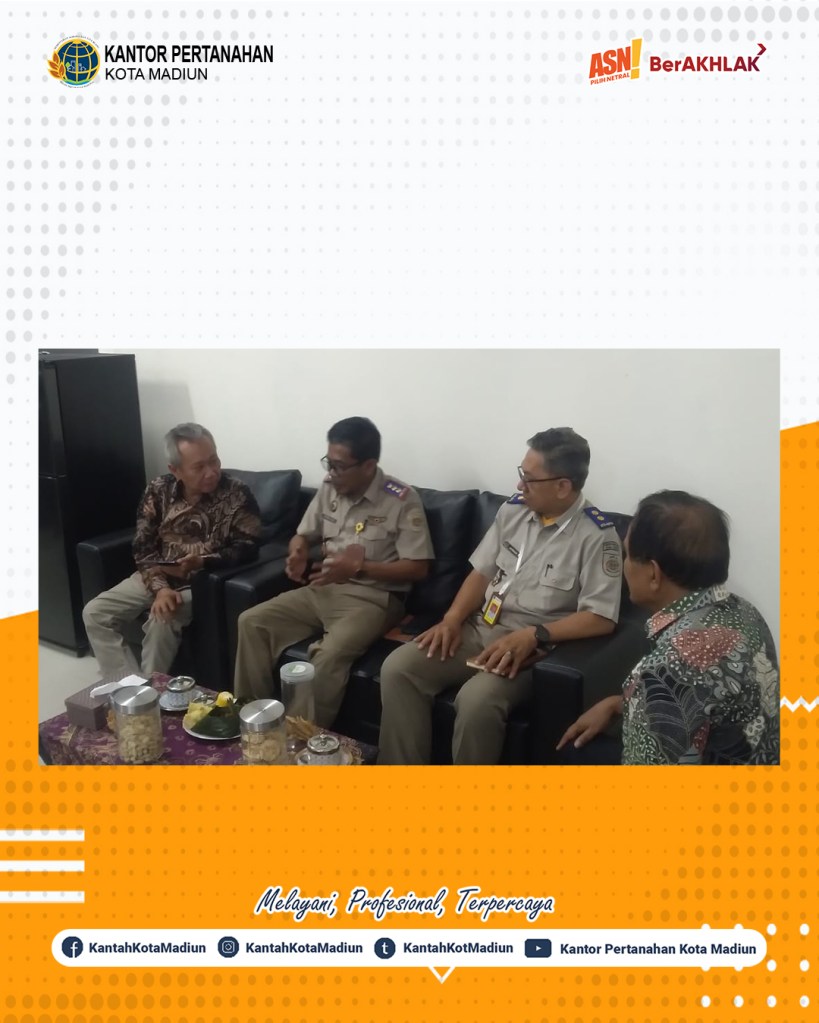 Koordinasi dan Sinkronisasi Kepala Kantor Pertanahan Kota Madiun Triawan Saleh S.T., M.Si. dengan Rektor UMMAD (Universitas Muhammadiyah Madiun) Prof. Dr. Sofyan Anif, M.Si sehubungan dengan pelibatan mahasiswa UMMAD (Universitas Muhammadiyah Madiun) dalam percepatan Sertipikasi Tanah Wakaf/Milik Persyarikatan Muhammadiyah melalui kegiatan KKN/Pengabdian Masyarkat Mahasiswa UMMAD (Universitas Muhammadiyah Madiun).