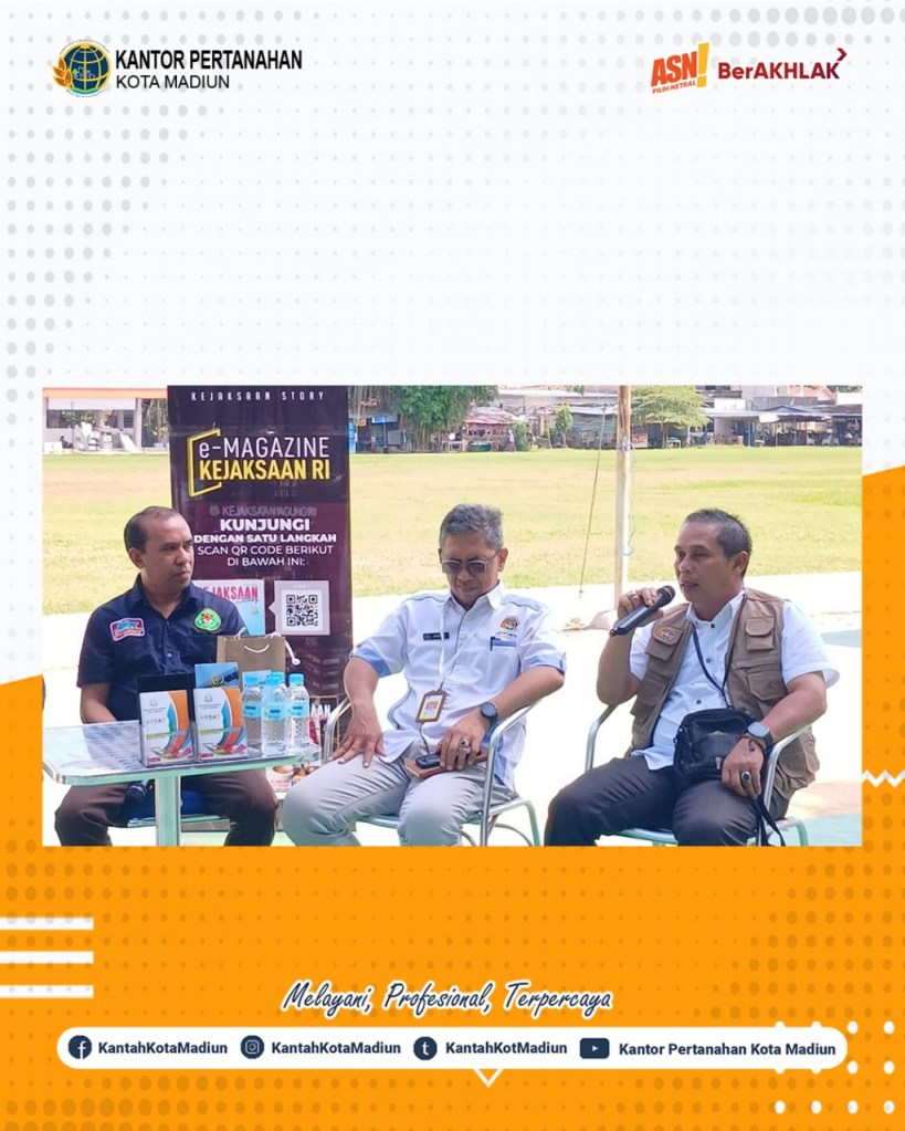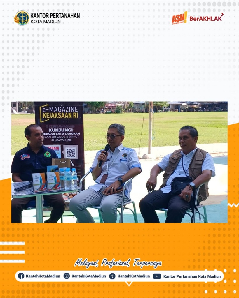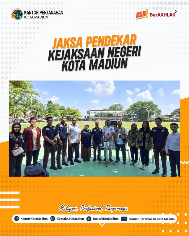 Halo #SobATRBPN, Hari ini Rabu (04/06/2025) Kantor Pertanahan Kota Madiun mengikuti JAdikan aKu SAhabat melalui PENyuluhan/PENerangan hukum untuk lebih DEKat masyARakat (Jaksa Pendekar) Kejaksaan Negeri Kota Madiun. Turut hadir Kepala Seksi Penetapan Hak dan Pendaftaran, Bapak R. Rusmarjanto, A.Ptnh., M.M.