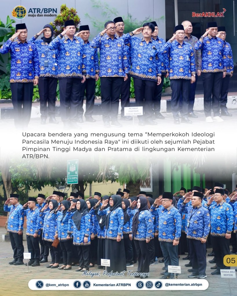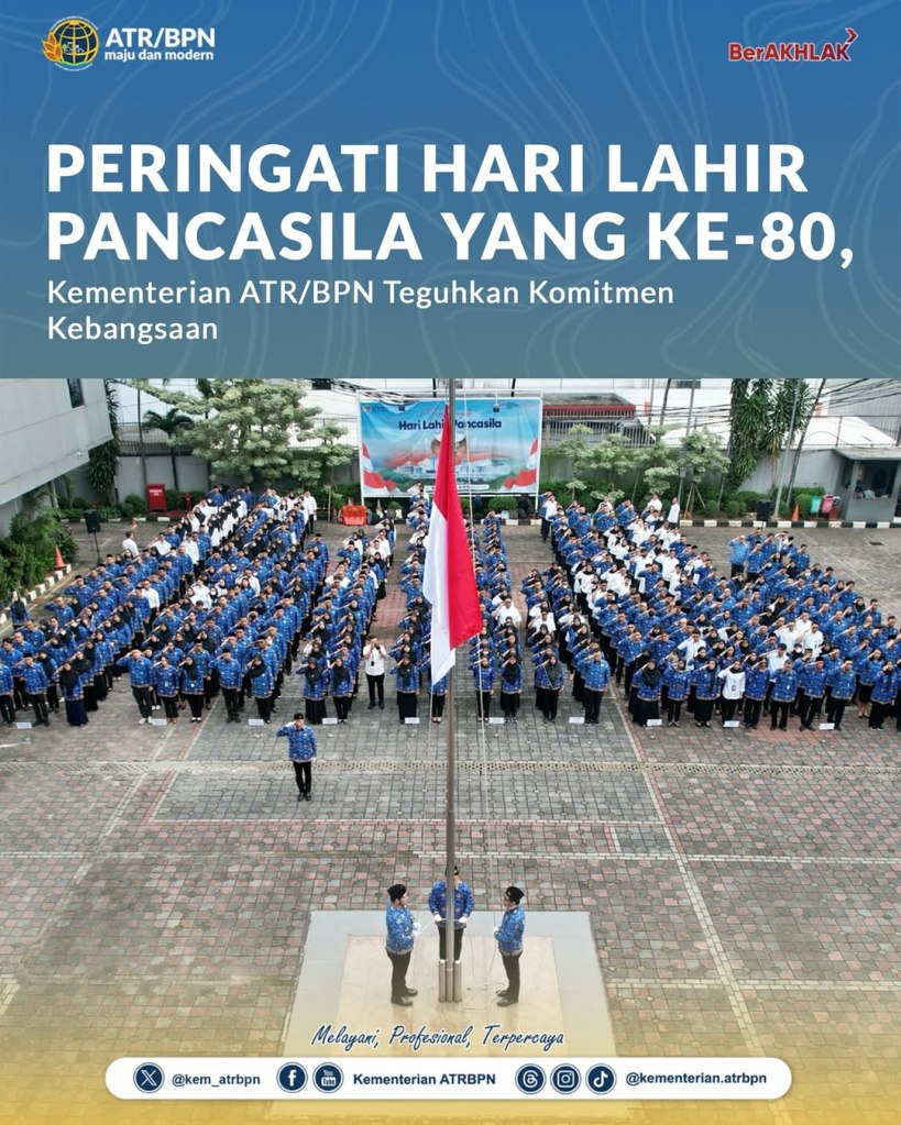 Kementerian Agraria dan Tata Ruang/Badan Pertanahan Nasional (ATR/BPN) menggelar Upacara Peringatan Hari Lahir Pancasila yang ke-80 pada Senin (02/06/2025). Bertindak sebagai inspektur upacara, yakni Direktur Jenderal Penanganan Sengketa dan Konflik Pertanahan, Iljas Tedjo Prijono.