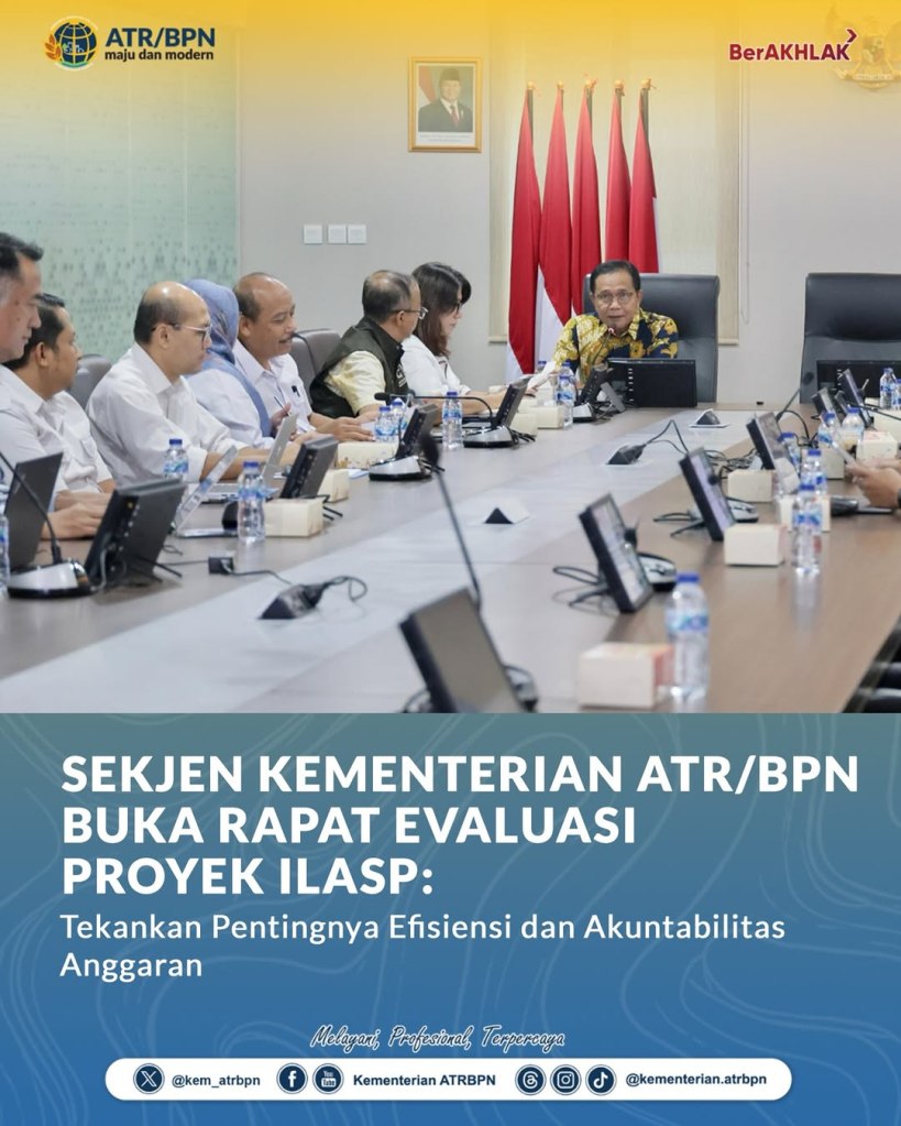 Sekretaris Jenderal (Sekjen) Kementerian Agraria dan Tata Ruang/Badan Pertanahan Nasional (ATR/BPN), Pudji Prasetijanto Hadi, membuka Rapat Evaluasi Proyek Integrated Land Administration and Spatial Planning (ILASP), yang diselenggarakan di Ruang Rapat 401, Kementerian ATR/BPN, Jakarta, Kamis (05/06/2025). Kepada jajarannya, ia menekankan agar anggaran Proyek ILASP yang merupakan dana pinjaman dari Bank Dunia perlu digunakan secara efektif dan akuntabel.