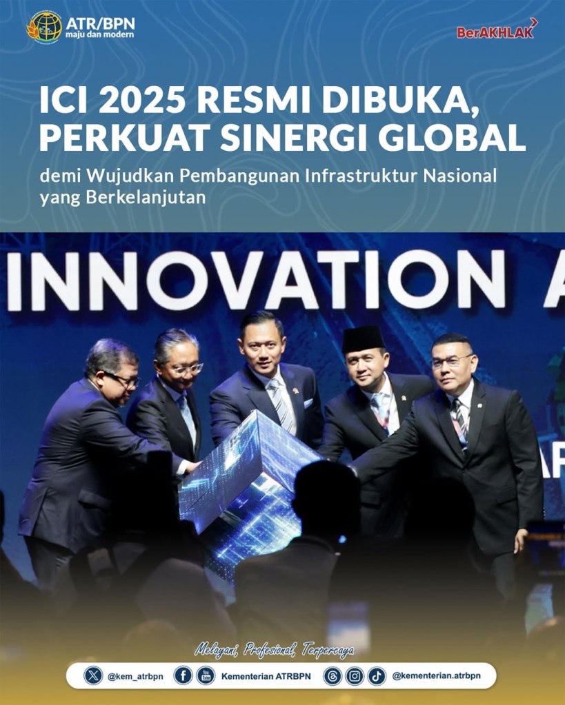 Wakil Menteri Agraria dan Tata Ruang/Wakil Kepala Badan Pertanahan Nasional (Wamen ATR/Waka BPN), Ossy Dermawan, ikut serta dalam pembukaan International Conference on Infrastructure (ICI) 2025 yang diinisiasi oleh Kementerian Koordinator Infrastruktur dan Pembangunan Kewilayahan (Kemenko IPK) pada Rabu (11/06/2025). Menurut Wamen Ossy, konferensi ini memberi ruang untuk memperluas pemahaman berbagai pemangku kepentingan terhadap kebijakan dan praktik pembangunan infrastruktur di Indonesia.