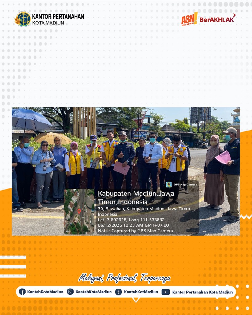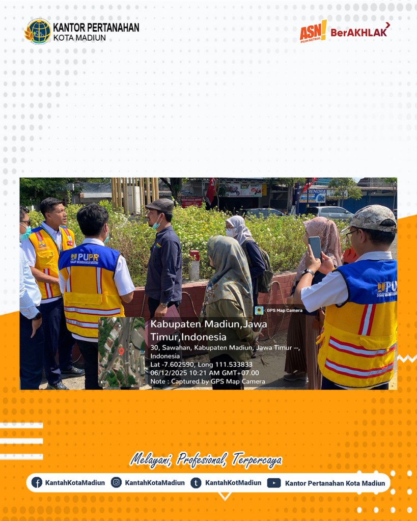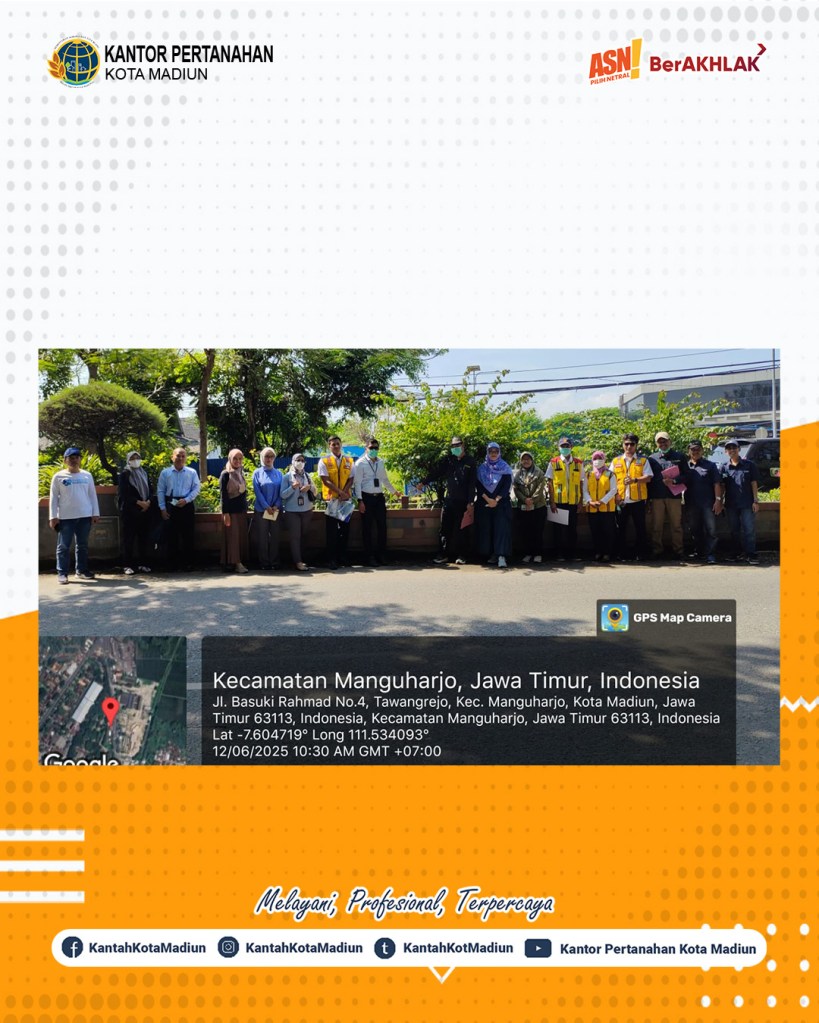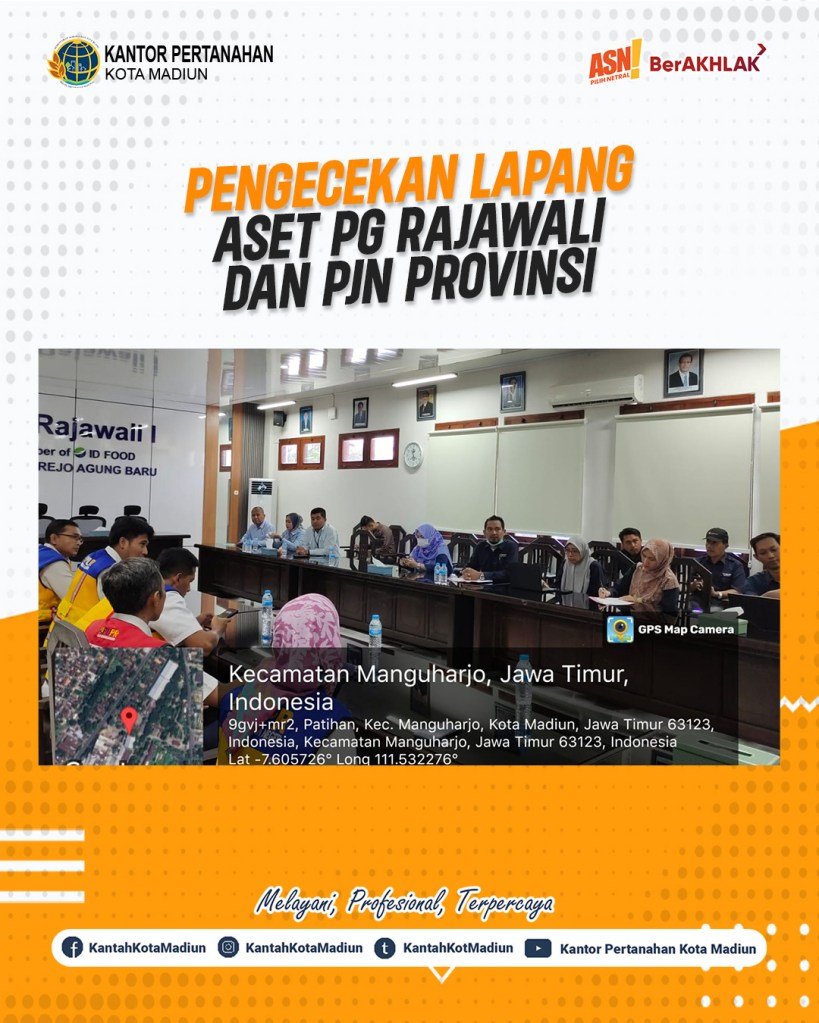 Halo #SobATRBPN, Hari ini Kamis (12/06/2025) Kantor Pertanahan Kota Madiun melaksanakan pengecekan lapang Aset Pabrik Gula (PG) Rajawali dan PJN Provinsi. Turut hadir Kepala Seksi Survei dan Pemetaan, Bapak Agus Cahyadi, S.ST. dan ditemani dengan Analis Survei, Pengukuran, dan Pemetaan dan Penata Kadastral Ahli Muda.