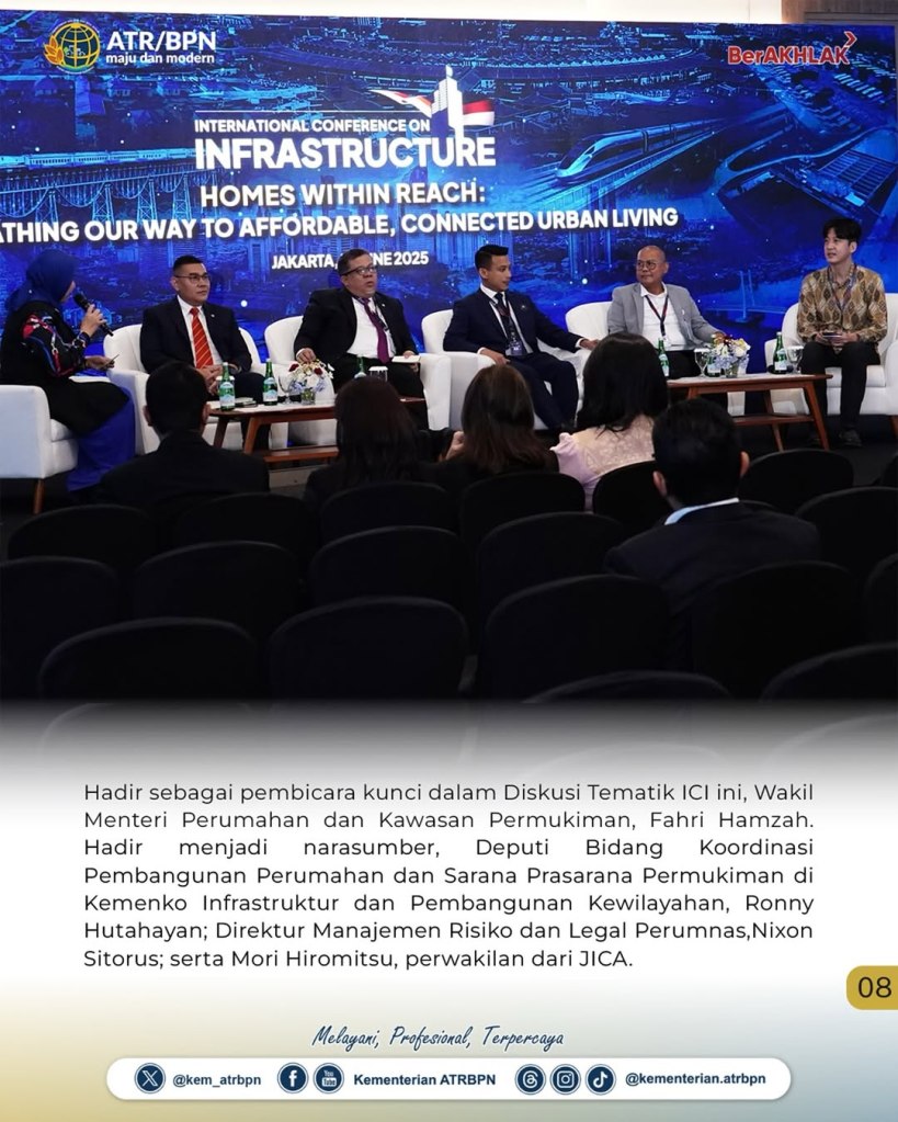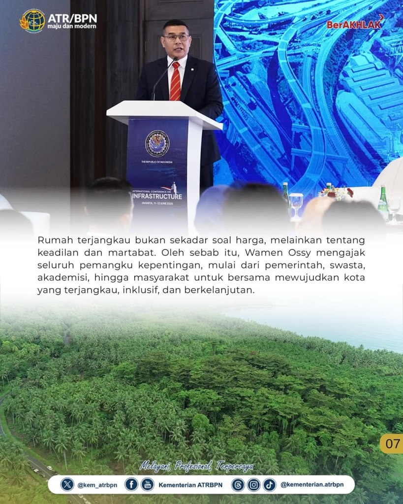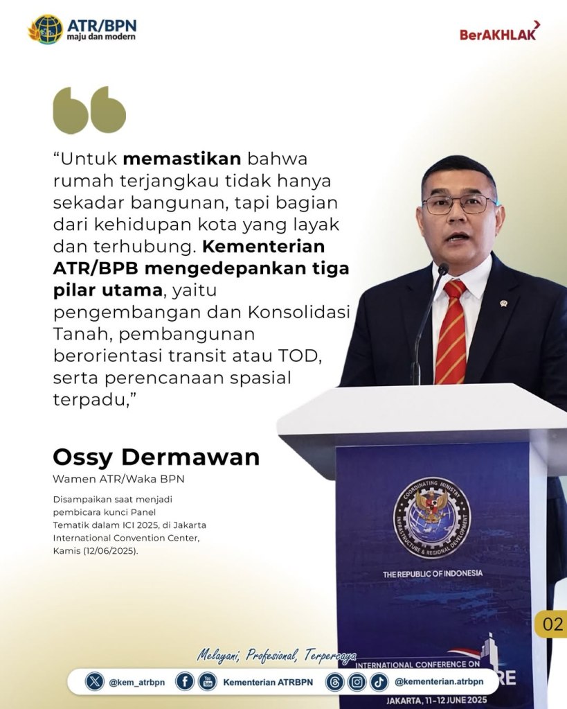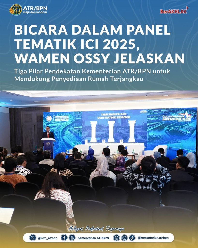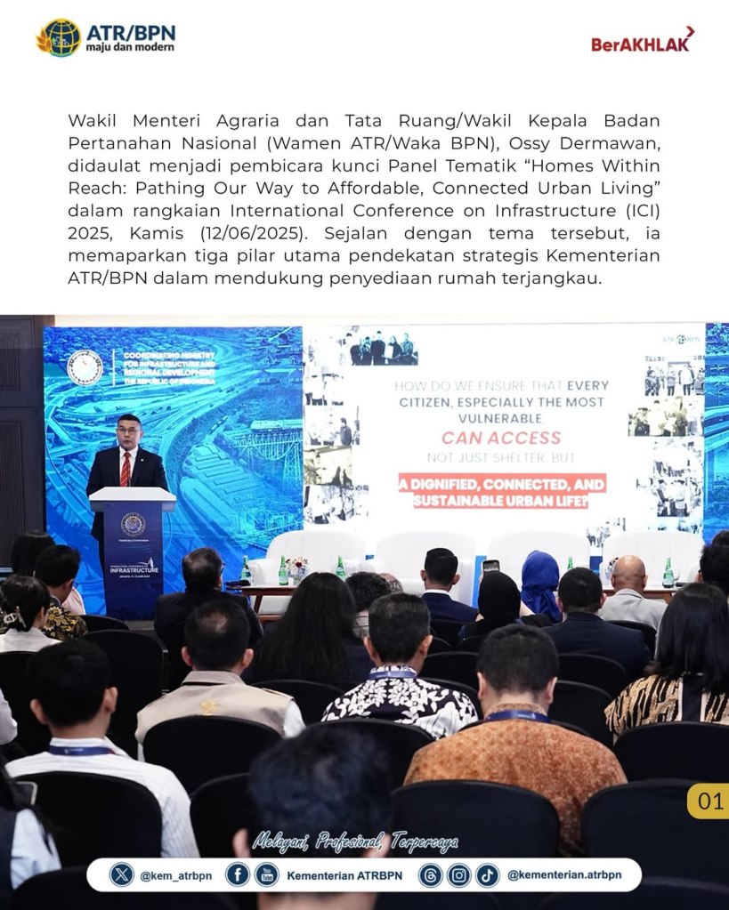 Wakil Menteri Agraria dan Tata Ruang/Wakil Kepala Badan Pertanahan Nasional (Wamen ATR/Waka BPN), Ossy Dermawan, didaulat menjadi pembicara kunci Panel Tematik “Homes Within Reach: Pathing Our Way to Affordable, Connected Urban Living” dalam rangkaian International Conference on Infrastructure (ICI) 2025, Kamis (12/06/2025). Sejalan dengan tema tersebut, ia memaparkan tiga pilar utama pendekatan strategis Kementerian ATR/BPN dalam mendukung penyediaan rumah terjangkau.