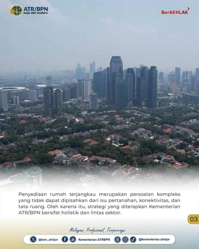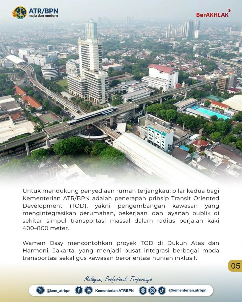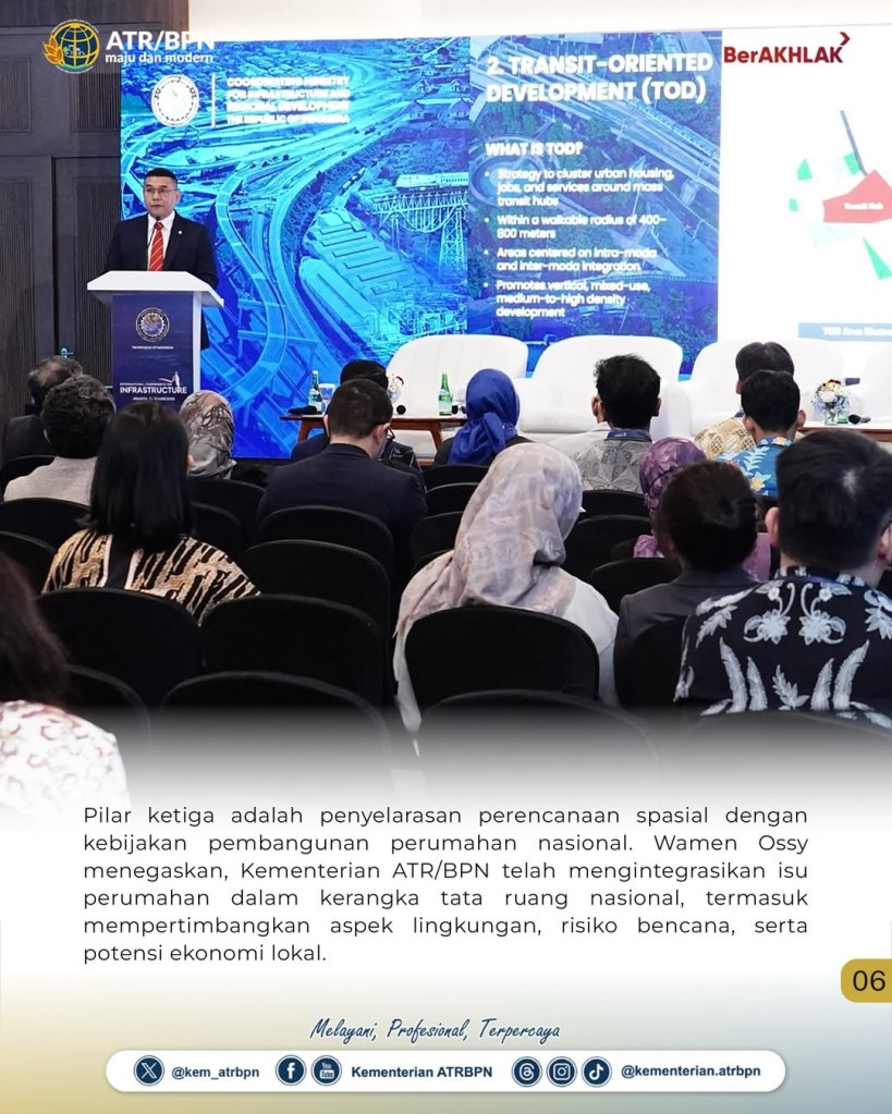 “Untuk memastikan bahwa rumah terjangkau tidak hanya sekadar bangunan, tapi bagian dari kehidupan kota yang layak dan terhubung. Kami mengedepankan tiga pilar utama, yaitu pengembangan dan konsolidasi tanah, pembangunan berorientasi transit atau TOD, serta perencanaan spasial terpadu,” ujar Wamen Ossy dalam konferensi internasional yang berlangsung di Jakarta International Convention Center (JICC).