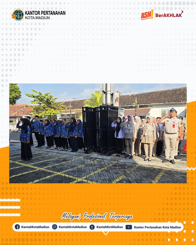 Halo #SobATRBPN, Hari ini Selasa (17/06/2025) Kantor Pertanahan Kota Madiun melaksanakan Apel Pagi yang bertempat di Halaman Depan Kantor Pertanahan Kota Madiun. Yang bertindak sebagai Pembina Upacara, Kepala Seksi Pengadaan Tanah dan Pengembangan, Bapak Geger Teguh Juwono, A.Ptnh. dan diikuti oleh seluruh Pejabat Pengawas dan Jajaran Kantor Pertanahan Kota Madiun.