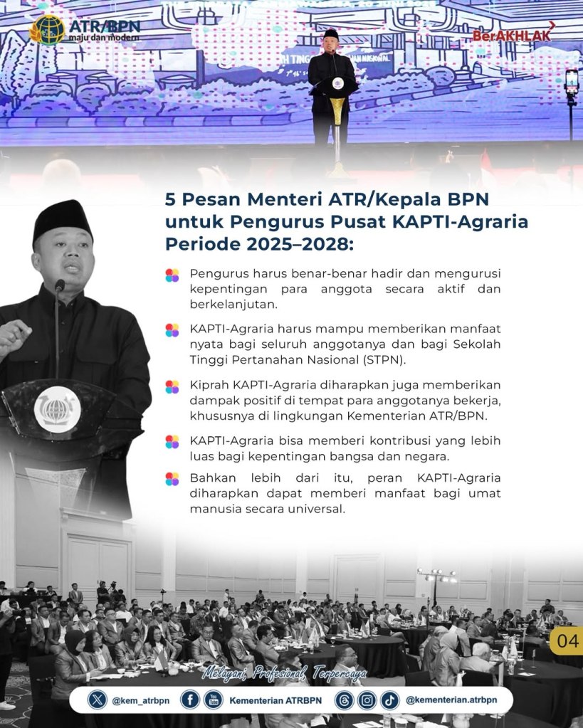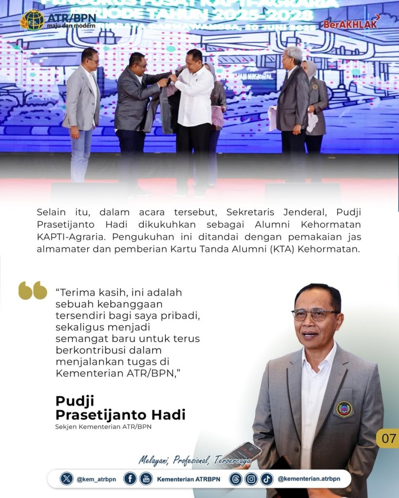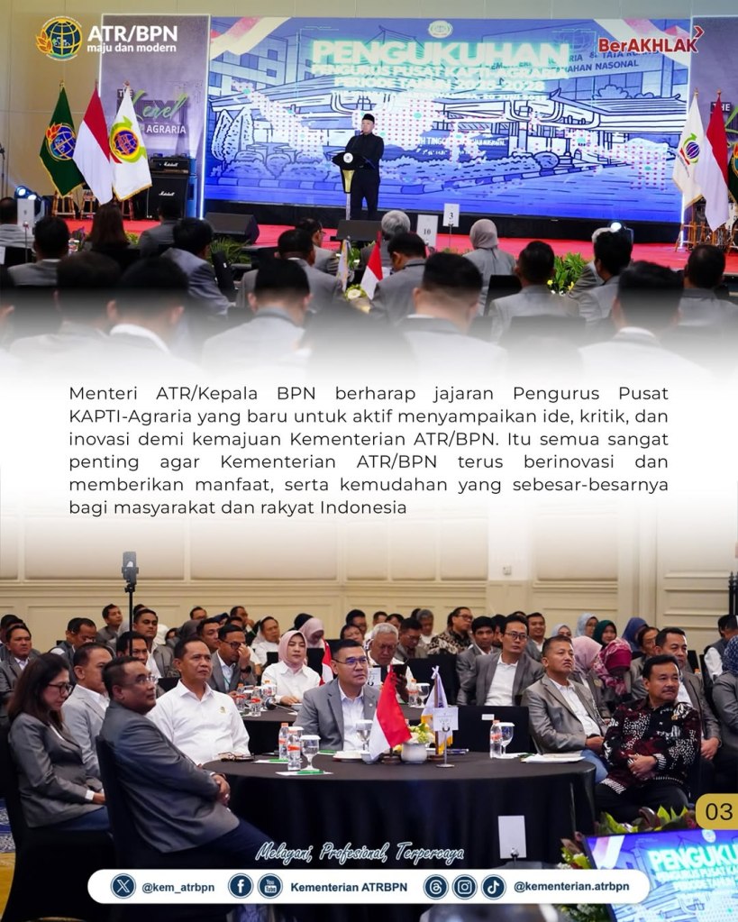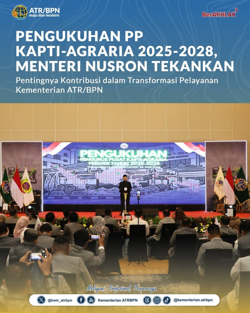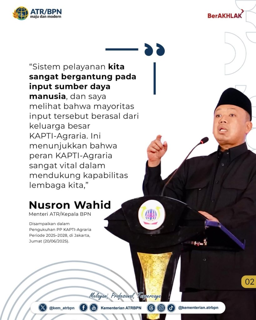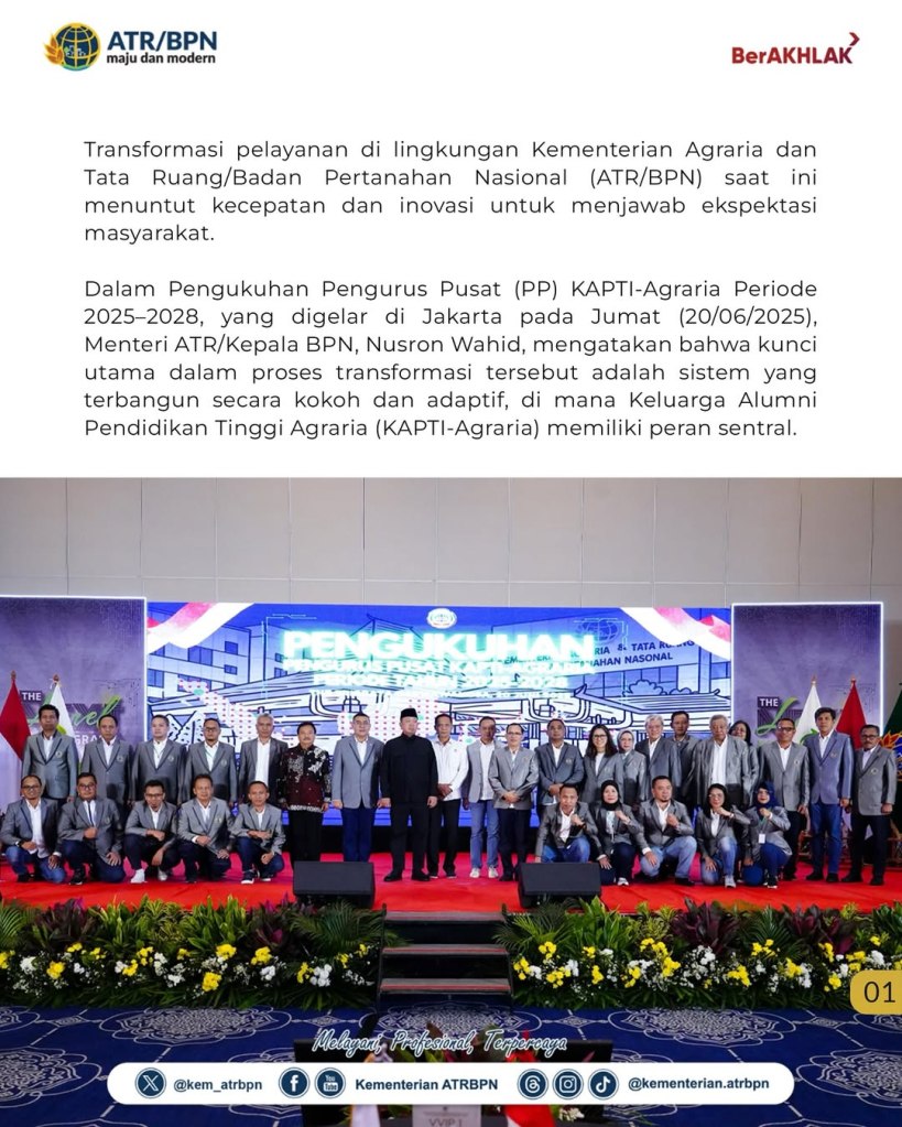 Repost from @kementerian.atrbpn Transformasi pelayanan di lingkungan Kementerian Agraria dan Tata Ruang/Badan Pertanahan Nasional (ATR/BPN) saat ini menuntut kecepatan dan inovasi untuk menjawab ekspektasi masyarakat. Menurut Menteri ATR/Kepala BPN, Nusron Wahid, kunci utama dalam proses transformasi tersebut adalah sistem yang terbangun secara kokoh dan adaptif, di mana Keluarga Alumni Pendidikan Tinggi Agraria (KAPTI-Agraria) memiliki peran sentral.