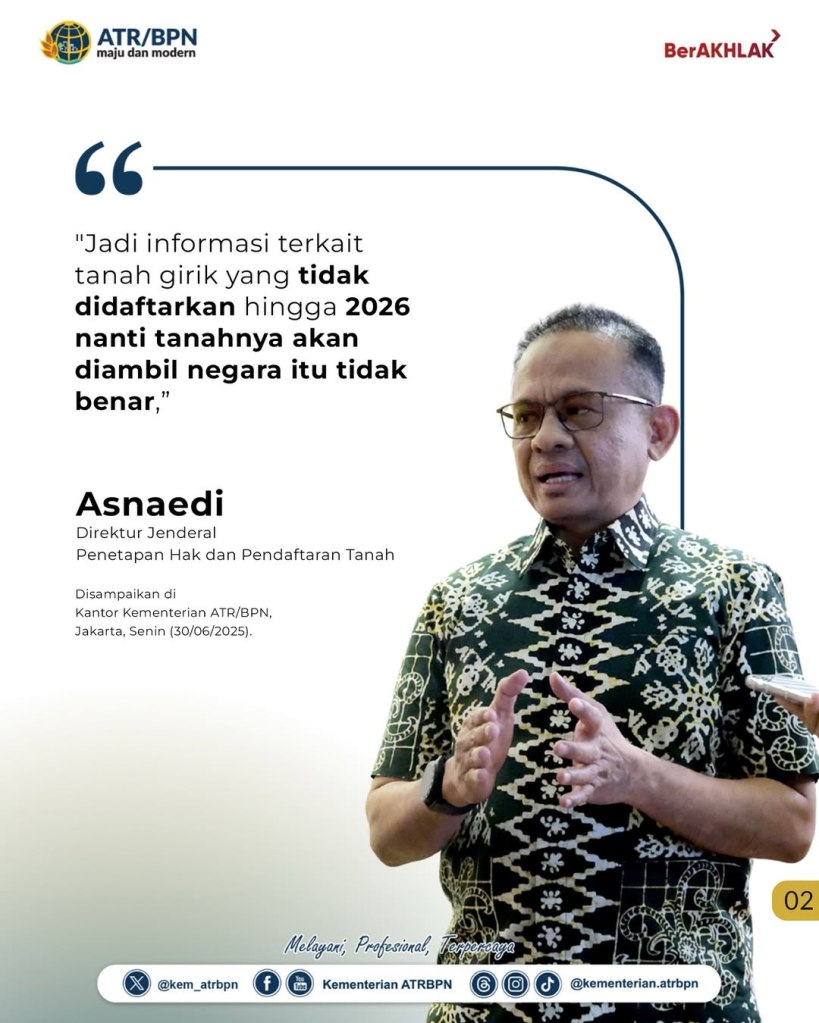 “Jadi informasi terkait tanah girik yang tidak didaftarkan hingga 2026 nanti tanahnya akan diambil negara itu tidak benar,” terang Asnaedi dalam keterangannya pada Senin (30/06/2025) di Kantor Kementerian ATR/BPN, Jakarta.