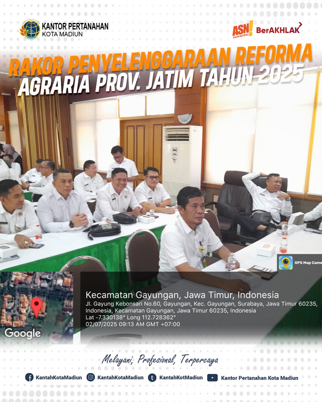Halo #SobATRBPN, Hari ini Rabu (02/07/2025) mengawali Hari di Bulan Juli, Kantor Pertanahan Kota Madiun mengikuti rapat koordinasi penyelenggaraan Reforma Agraria Provinsi Jawa Timur Tahun 2025 yang bertempat di Ruang Reforma Agraria Kantor Wilayah BPN Provinsi Jawa Timur, Jl. Gayung Kebonsari No. 60 Surabaya.