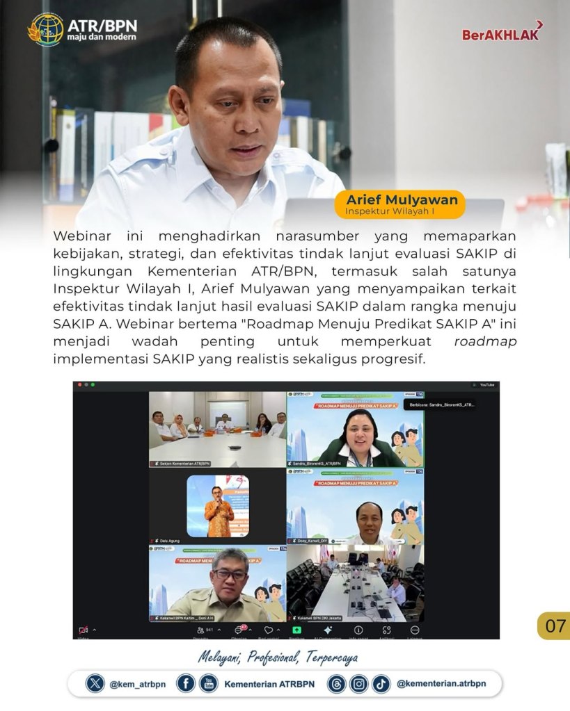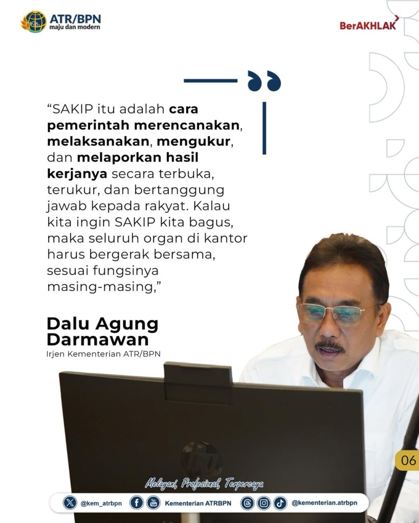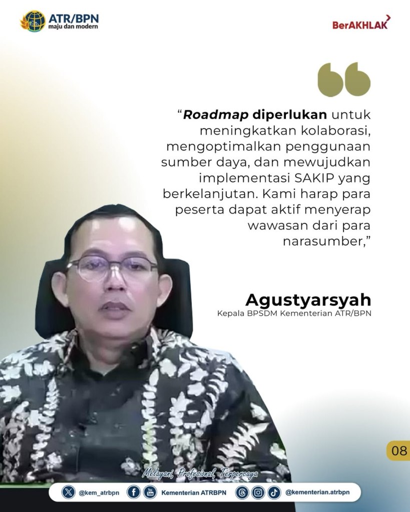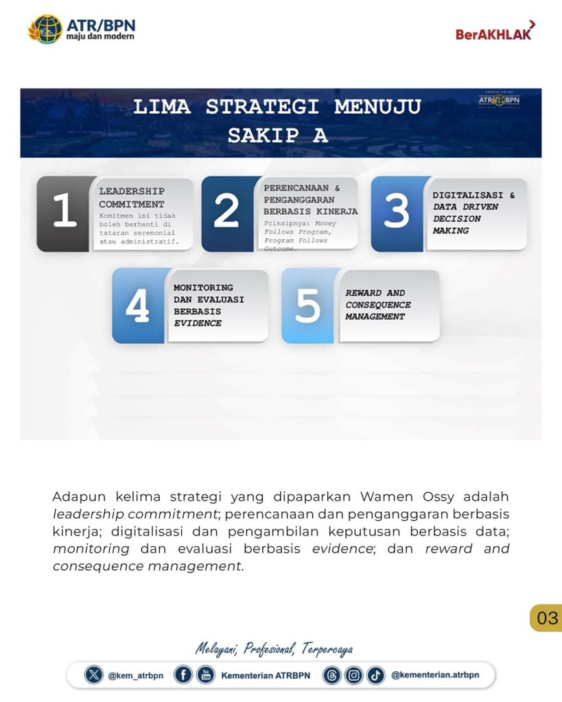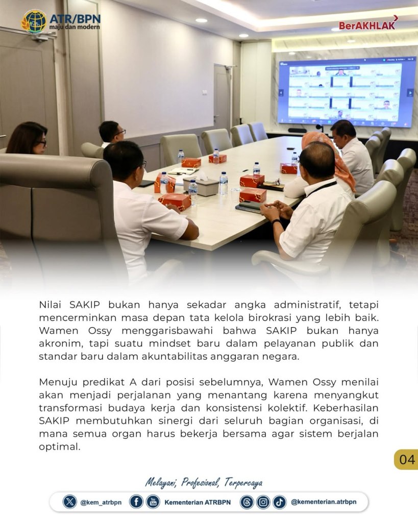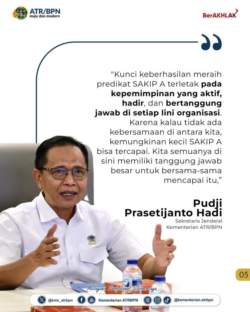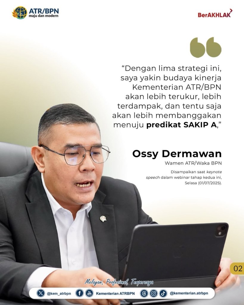 Kementerian Agraria dan Tata Ruang/Badan Pertanahan Nasional (ATR/BPN) menargetkan capaian tertinggi dalam Sistem Akuntabilitas Kinerja Instansi Pemerintah (SAKIP), yakni predikat A (Memuaskan). Dalam webinar bertema “Roadmap Menuju Predikat SAKIP A” yang diselenggarakan oleh BPSDM bekerja sama dengan Biro Perencanaan dan Kerja Sama, Wakil Menteri (Wamen) ATR/Wakil Kepala (Waka) BPN, Ossy Dermawan, memaparkan lima strategi utama yang menjadi langkah sistematis, terukur, dan konsisten menuju target SAKIP A.