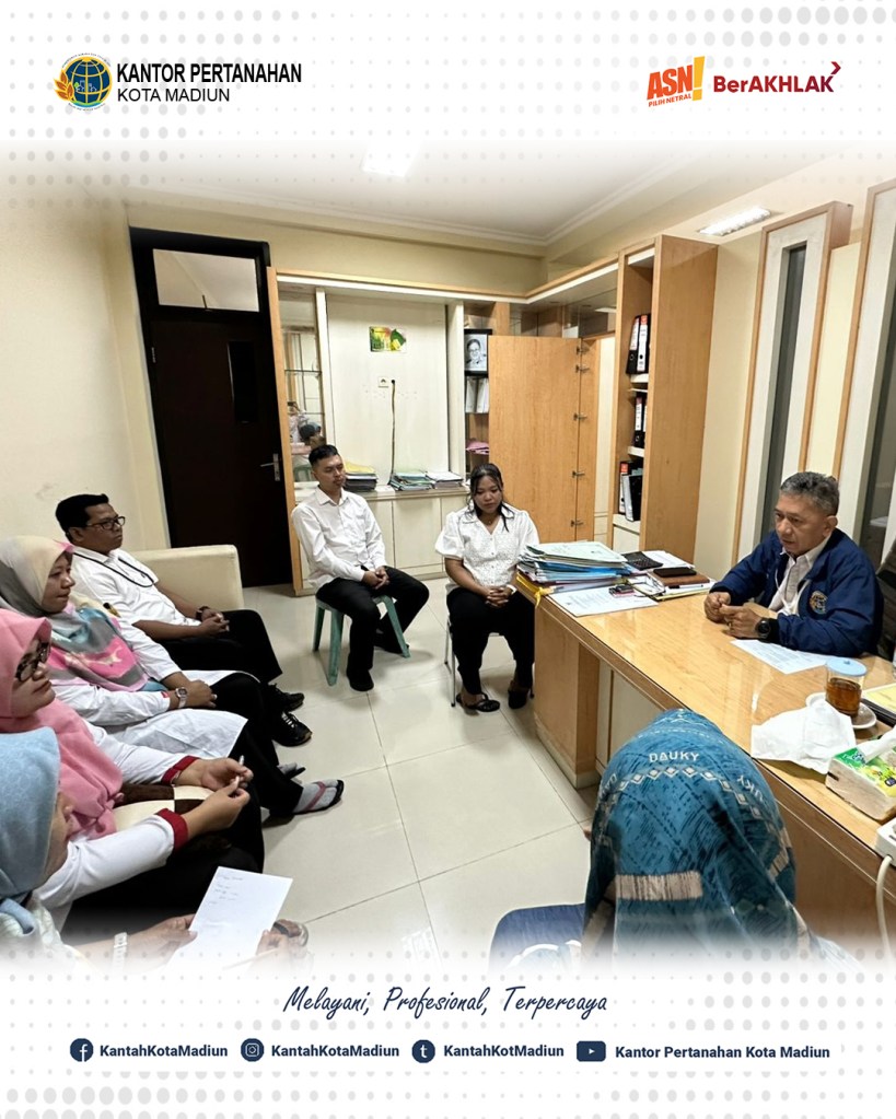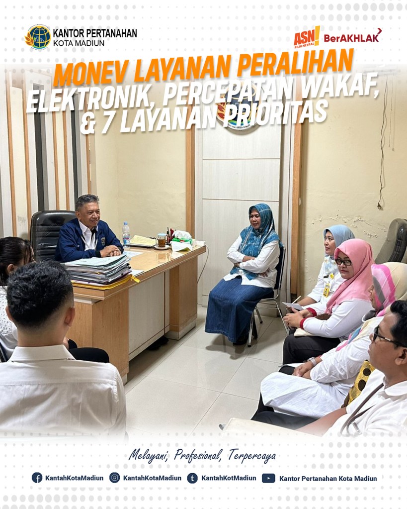 Halo #SobATRBPN, Hari ini Jumat (04/07/2025) Seksi Penetapan Hak dan Pendaftaran Kantor Pertanahan Kota Madiun melaksanakan monitoring dan evaluasi Layanan Peralihan Elektronik, Percepatan Wakaf, dan 7 Layanan Prioritas. Turut hadir Kepala Seksi Penetapan Hak dan Pendaftaran, Bapak R. Rusmarjanto Atmadi, A.Ptnh., M.M.
