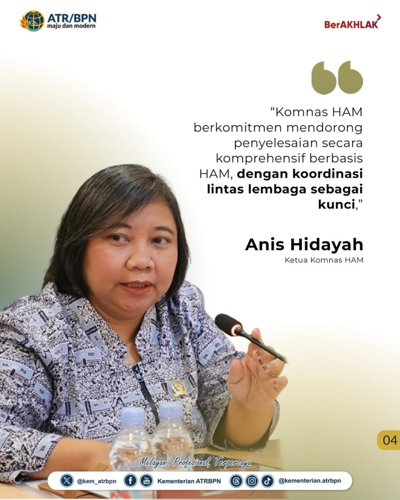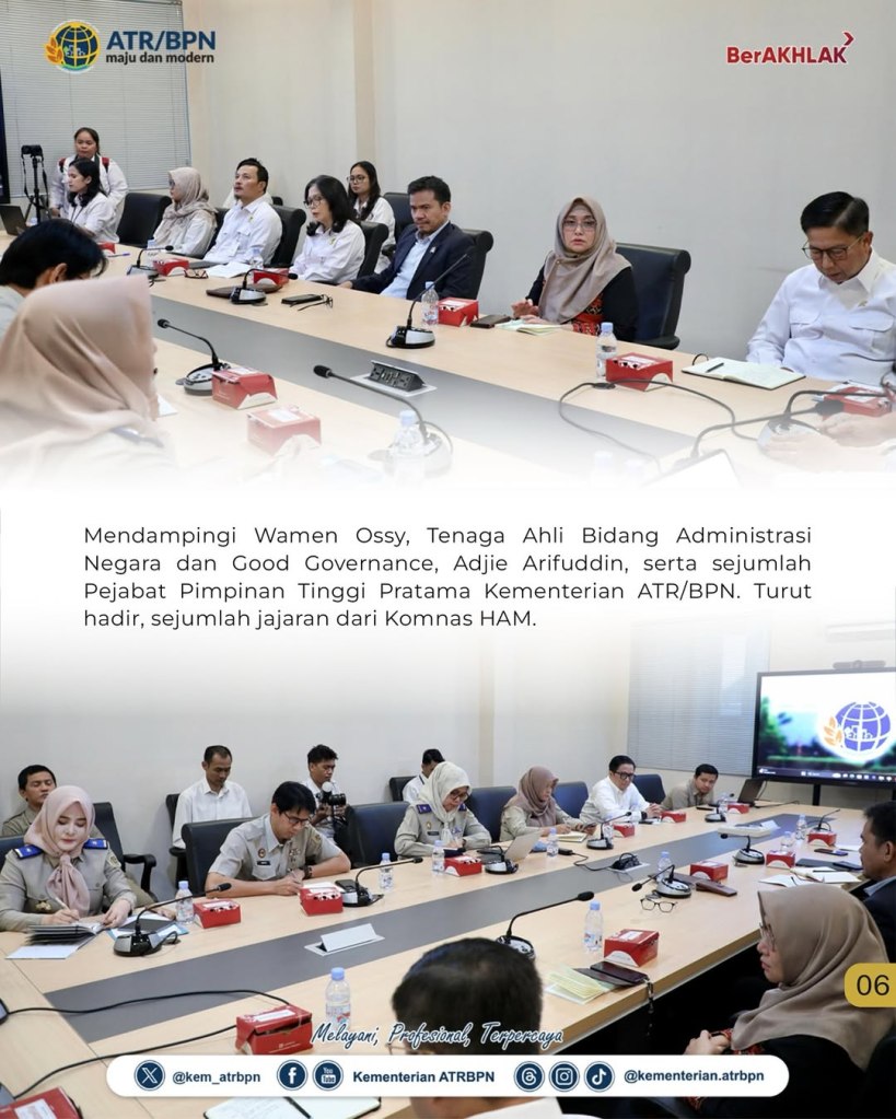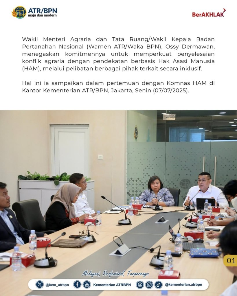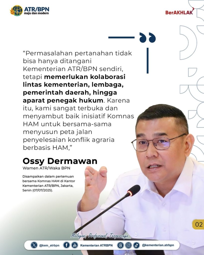 Wakil Menteri Agraria dan Tata Ruang/Wakil Kepala Badan Pertanahan Nasional (Wamen ATR/Waka BPN), Ossy Dermawan, menegaskan komitmennya untuk memperkuat penyelesaian konflik agraria dengan pendekatan berbasis Hak Asasi Manusia (HAM), melalui pelibatan berbagai pihak terkait secara inklusif. Hal ini ia sampaikan dalam pertemuan bersama jajaran Komisi Nasional (Komnas) HAM di Kantor Kementerian ATR/BPN, Jakarta, Senin (07/07/2025).