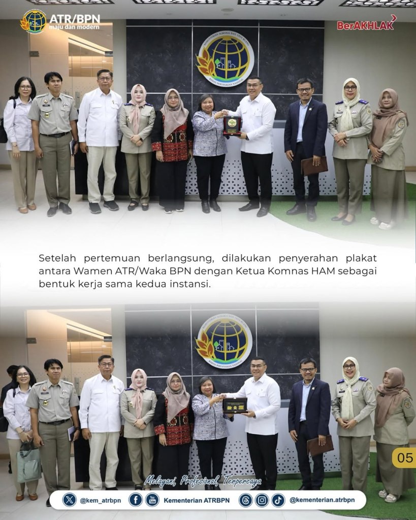 “Permasalahan pertanahan tidak bisa hanya ditangani Kementerian ATR/BPN sendiri, tetapi memerlukan kolaborasi lintas kementerian, lembaga, pemerintah daerah, hingga aparat penegak hukum. Karena itu, kami sangat terbuka dan menyambut baik inisiatif Komnas HAM untuk bersama-sama menyusun peta jalan penyelesaian konflik agraria berbasis HAM,” ujar Wamen Ossy.