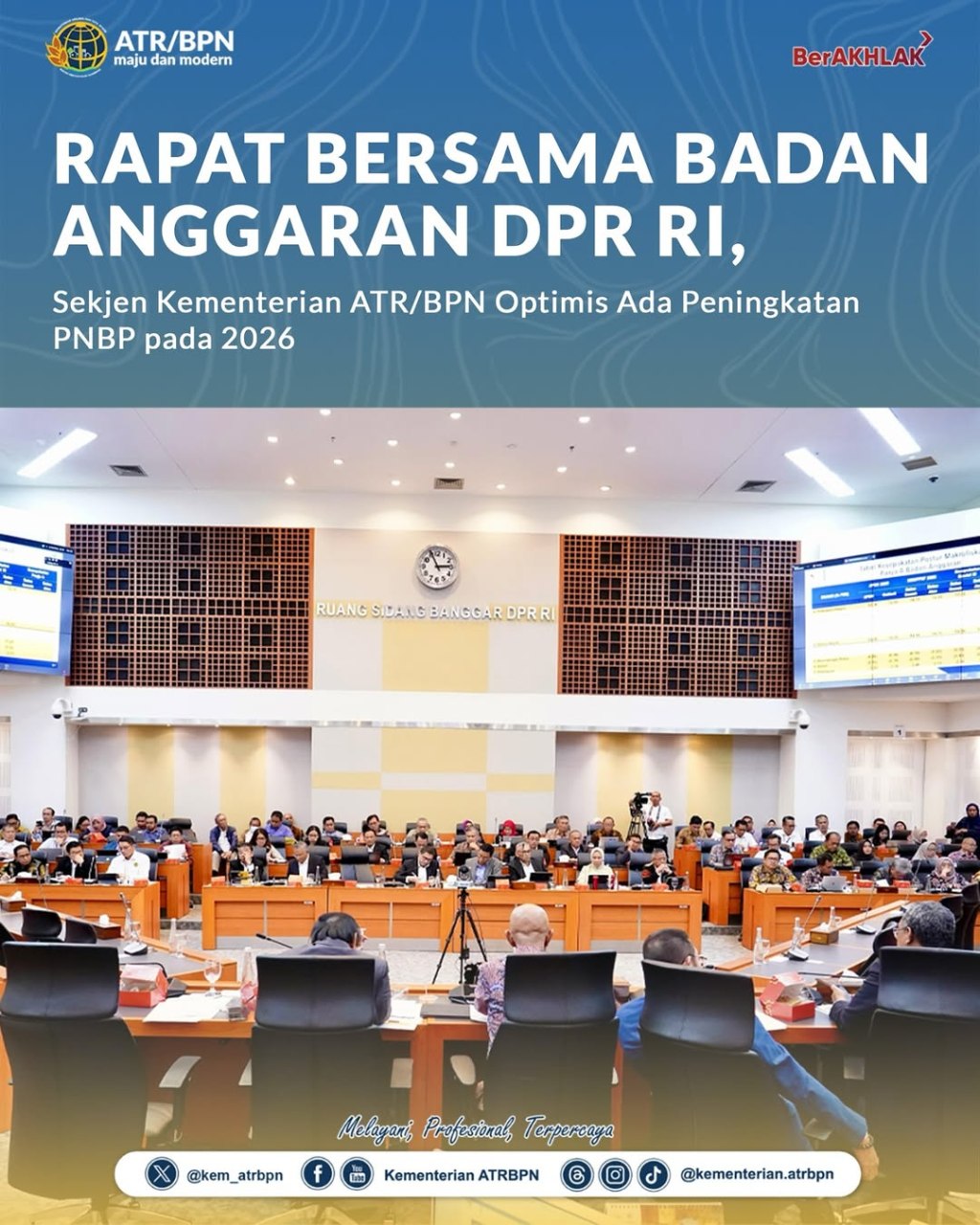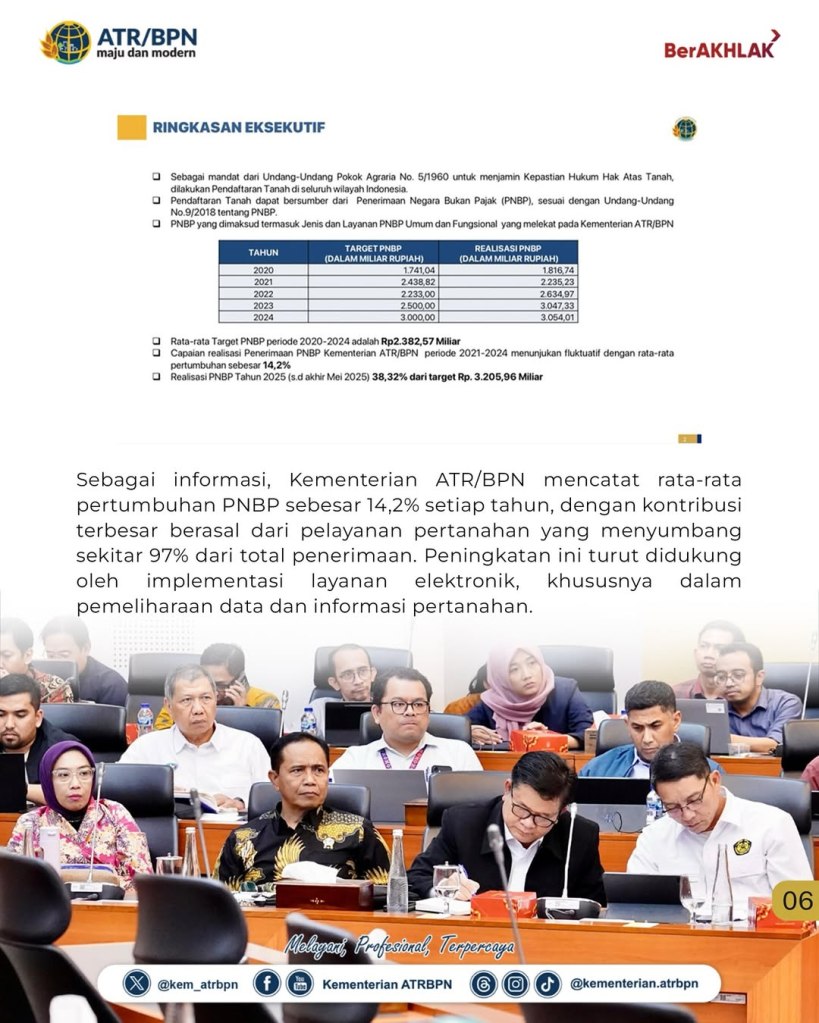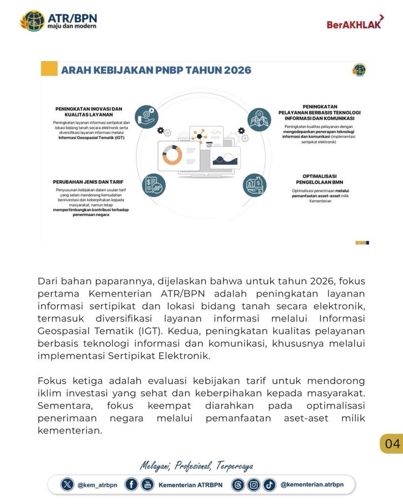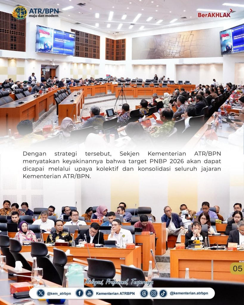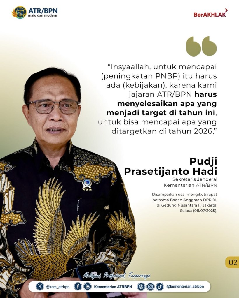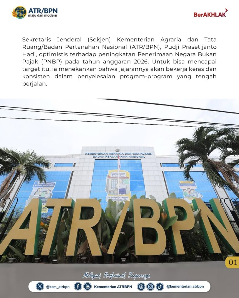 Sekretaris Jenderal (Sekjen) Kementerian Agraria dan Tata Ruang/Badan Pertanahan Nasional (ATR/BPN), Pudji Prasetijanto Hadi, optimistis terhadap peningkatan Penerimaan Negara Bukan Pajak (PNBP) pada tahun anggaran 2026. Untuk bisa mencapai target itu, ia menekankan bahwa jajarannya akan bekerja keras dan konsisten dalam penyelesaian program-program yang tengah berjalan.