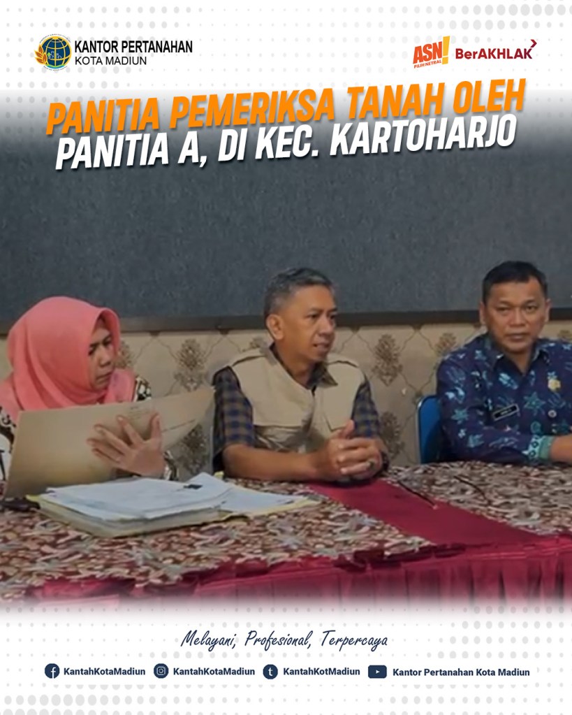Halo #SobATRBPN, Hari ini Kamis (10/07/2025) Kantor Pertanahan Kota Madiun dalam hal ini Panitia Pemeriksan Tanah melaksanakan kegiatan Panitia A yang bertempat di Kecamatan Kartoharjo. Turut hadir Kepala Seksi Penetapan Hak dan Pendaftaran, Bapak R. Rusmarjanto Atmadi, A.Ptnh., M.M. dan Tim Panitia A.