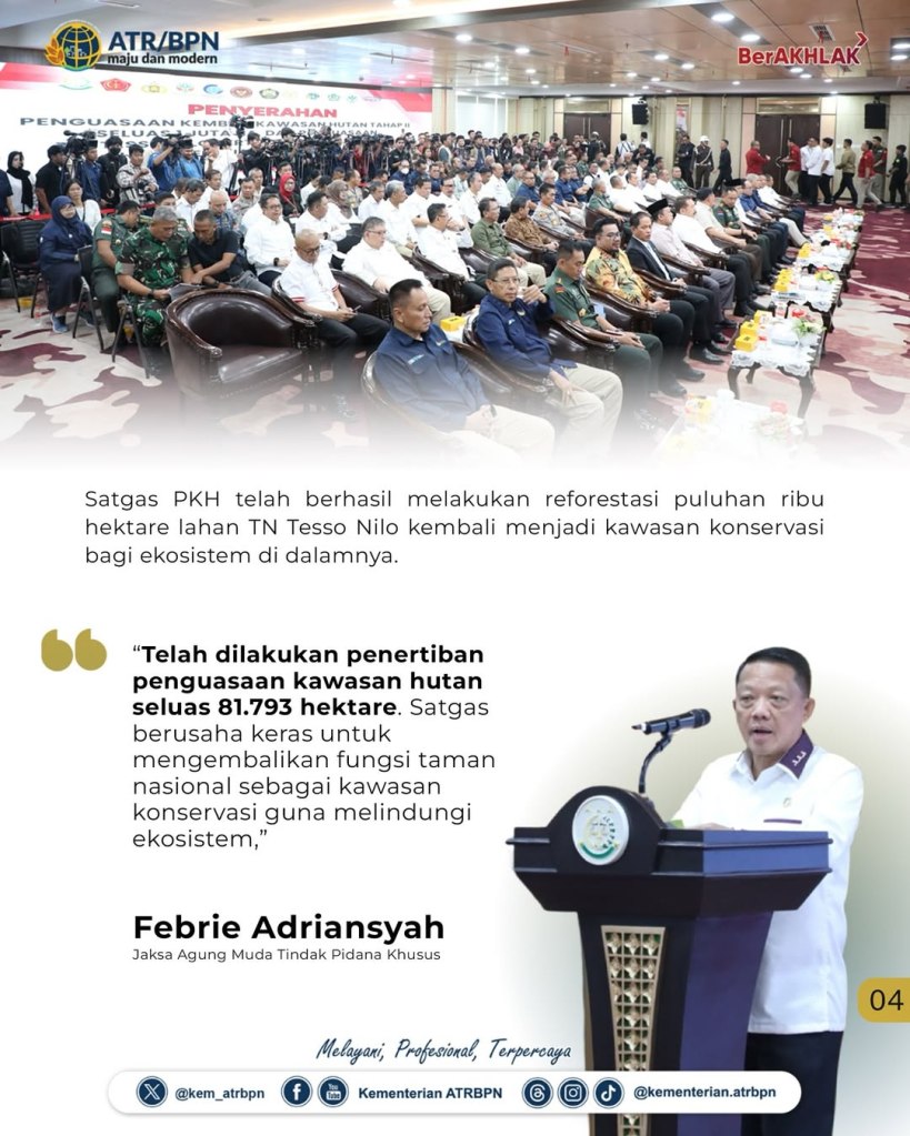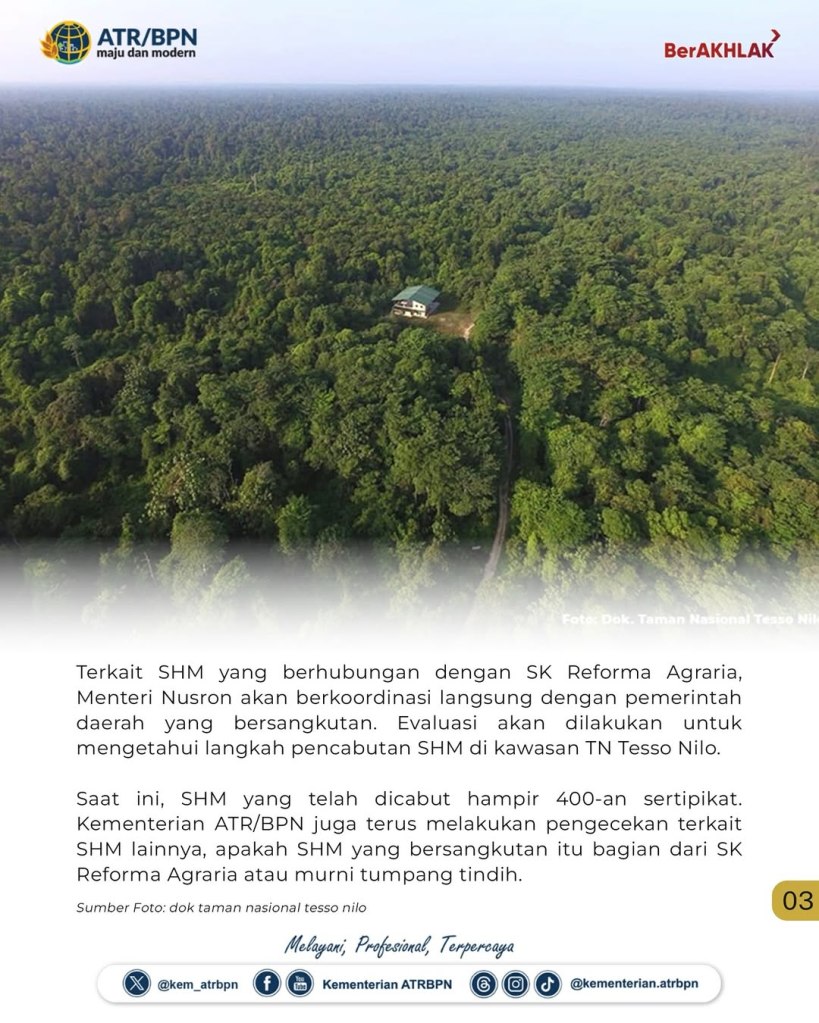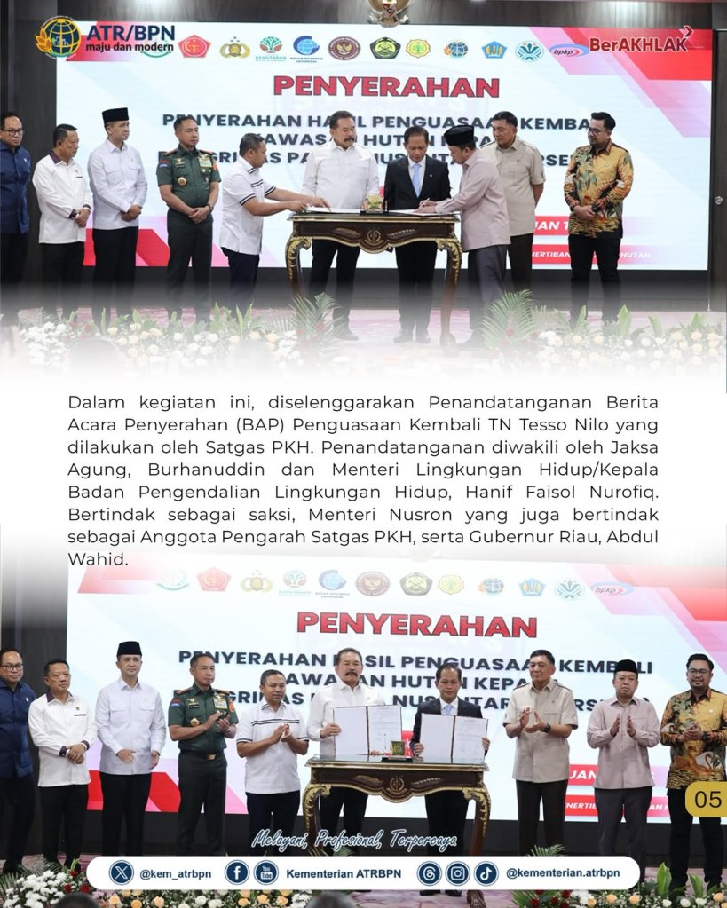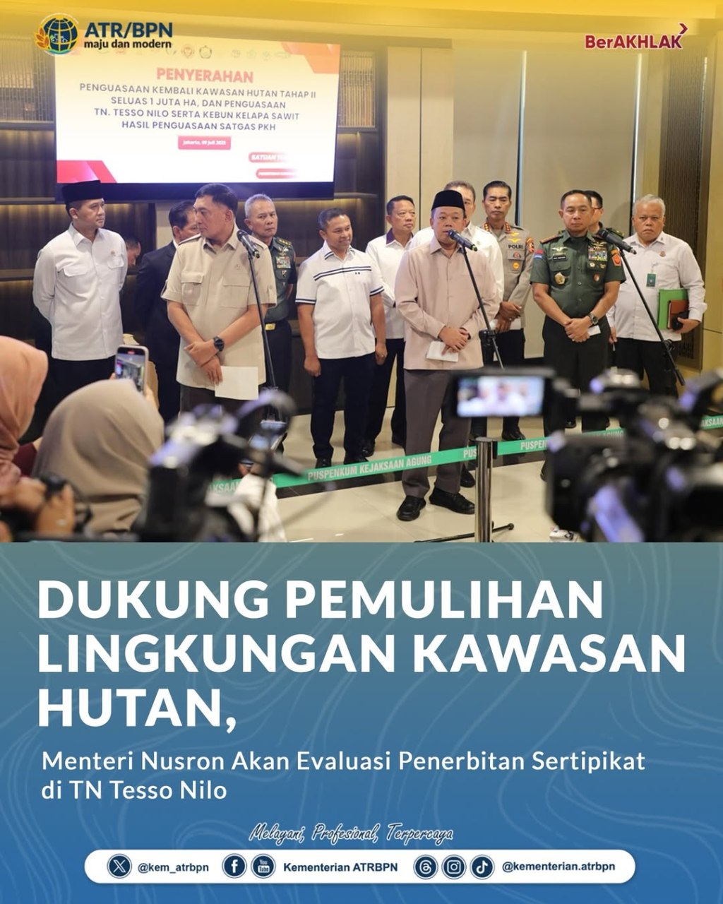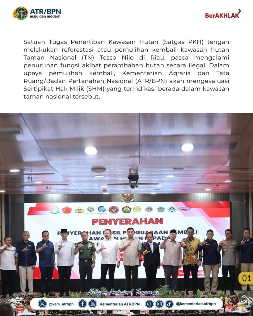Satuan Tugas Penertiban Kawasan Hutan (Satgas PKH) tengah melakukan reforestasi atau pemulihan kembali kawasan hutan Taman Nasional (TN) Tesso Nilo di Riau, pasca mengalami penurunan fungsi akibat perambahan hutan secara ilegal. Dalam upaya pemulihan kembali, Kementerian Agraria dan Tata Ruang/Badan Pertanahan Nasional (ATR/BPN) akan mengevaluasi Sertipikat Hak Milik (SHM) yang terindikasi berada dalam kawasan taman nasional tersebut.