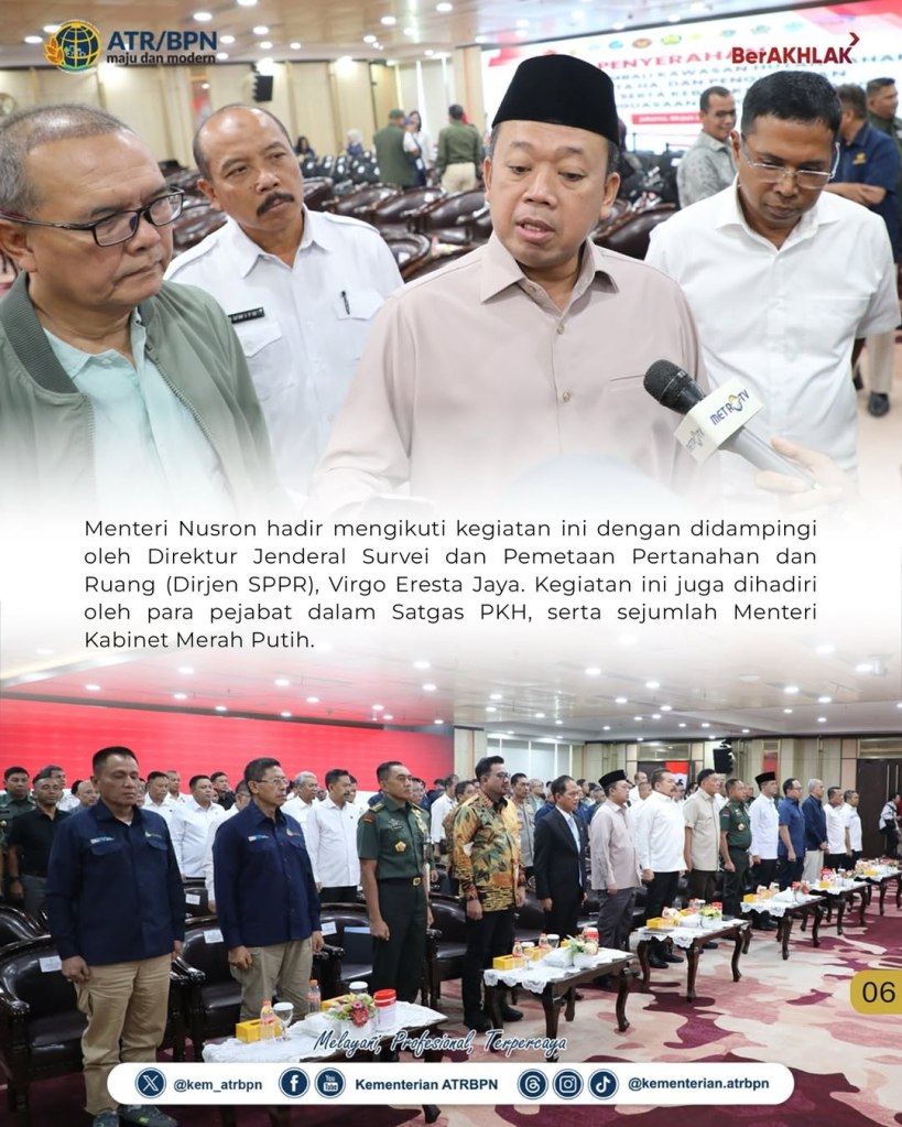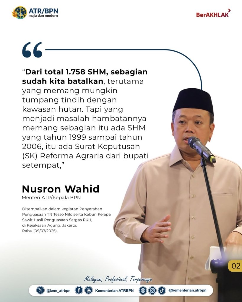 “Dari total 1.758 SHM, sebagian sudah kita batalkan, terutama yang memang mungkin tumpang tindih dengan kawasan hutan. Tapi yang menjadi masalah hambatannya memang sebagian itu ada SHM yang tahun 1999 sampai tahun 2006, itu ada Surat Keputusan (SK) Reforma Agraria dari bupati setempat,” ujar Menteri ATR/Kepala BPN, Nusron Wahid dalam kegiatan Penyerahan Penguasaan Kembali Kawasan Hutan Tahap II Seluas 1 Juta Hektare, dan Penguasaan TN Tesso Nilo serta Kebun Kelapa Sawit Hasil Penguasaan Satgas PKH, di Kejaksaan Agung, Jakarta, Rabu (09/07/2025).